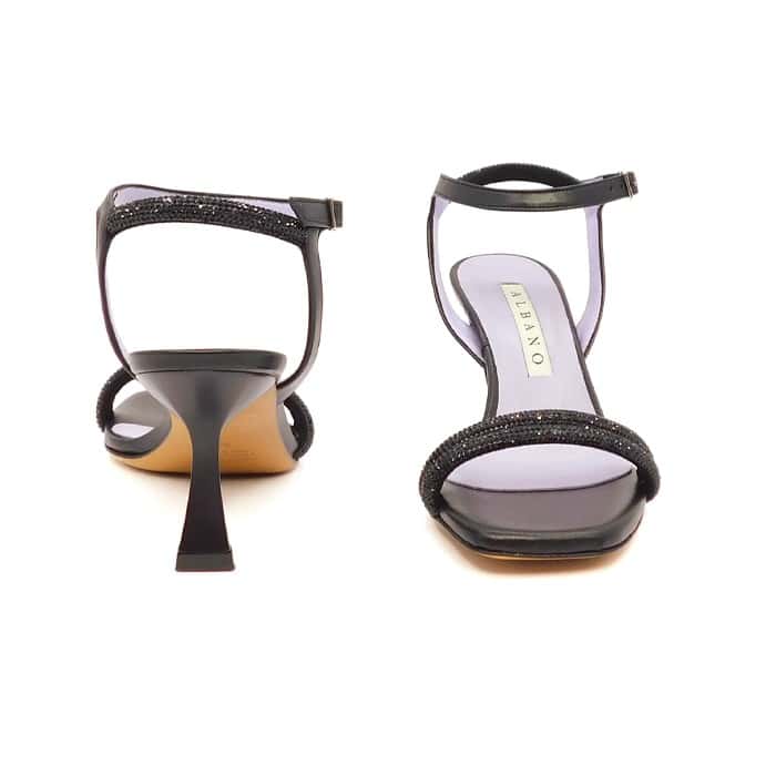 Sandalo in vitello con doppia fascia di strass e cinturino alla caviglia. Interno in pelle. Tacco 7 cm a rocchetto. Fondo in cuoio.