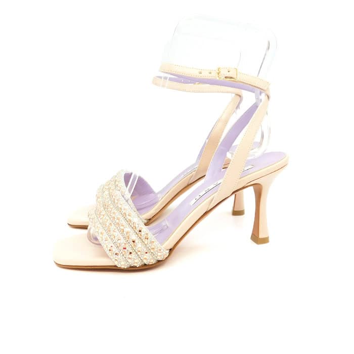 Sandalo in vitello con fascia decorata di strass e specchietti. Cinturino alla caviglia regolabile. Interno in pelle. Tacco 8 cm.