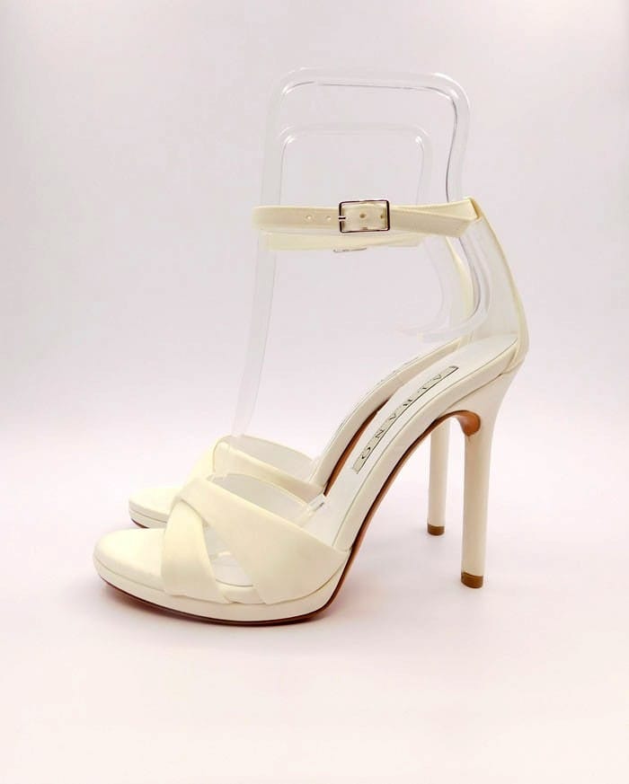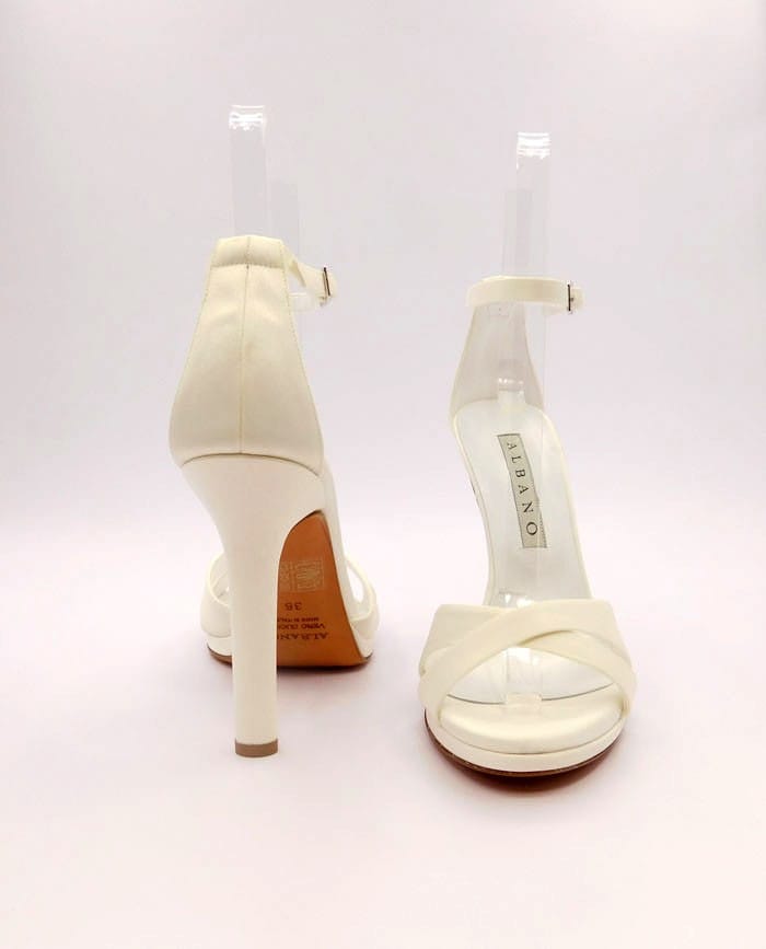 Sandalo in raso bianco con fasce ad incrocio. Interno in pelle. Tacco 10 cm. Fondo platform in cuoio.