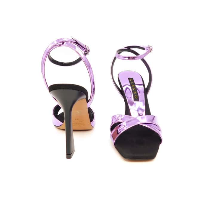 Sandalo laminato effetto specchio con cinturino alla caviglia regolabile. Interno in pelle. Tacco 10 cm.