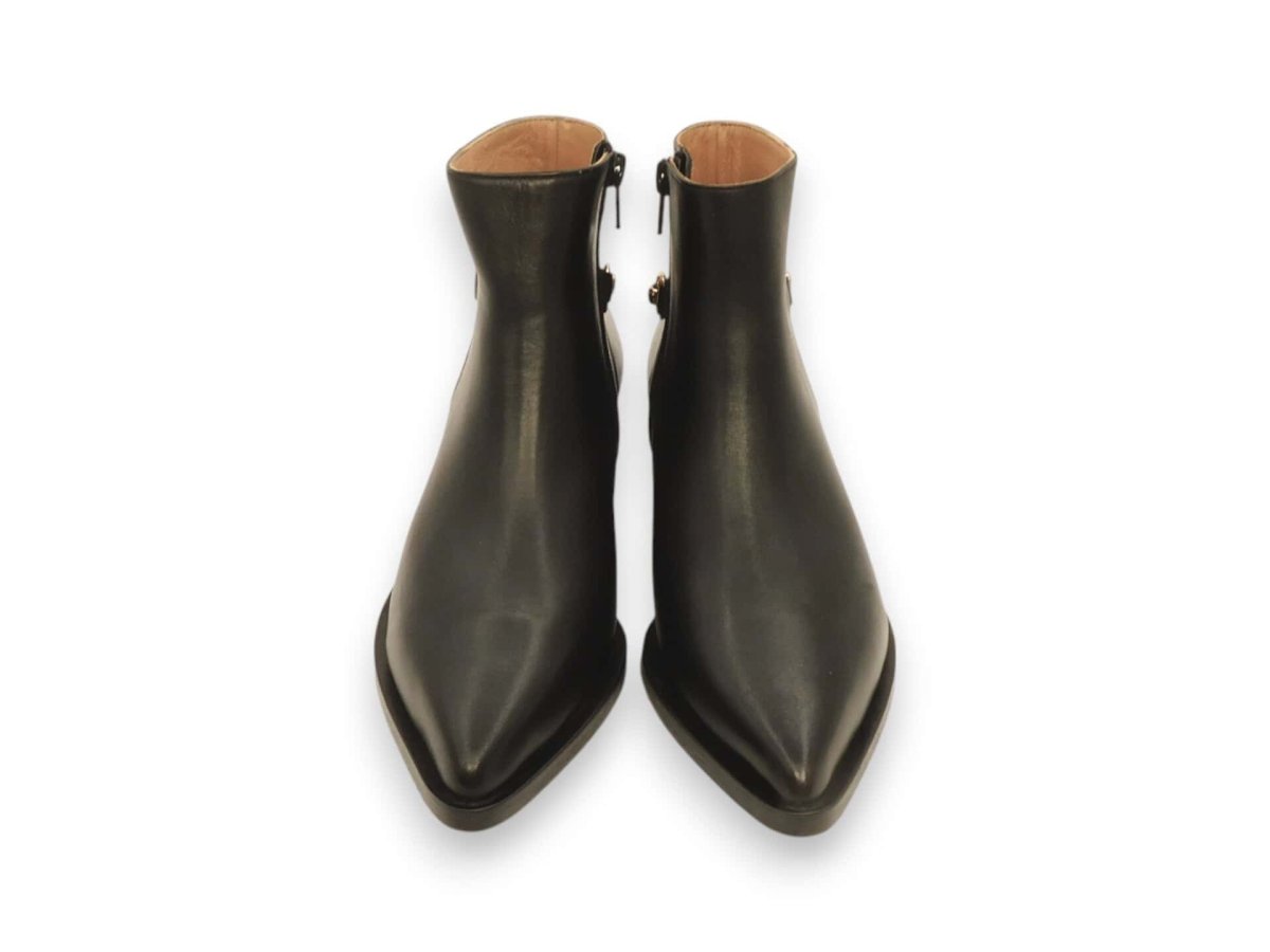 Tronchetto texano con morsetto in metallo colore oro. Interno in pelle. Tomaia in pelle. Fondo in cuoio. Allacciatura con zip interna.