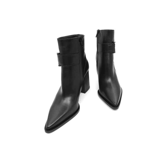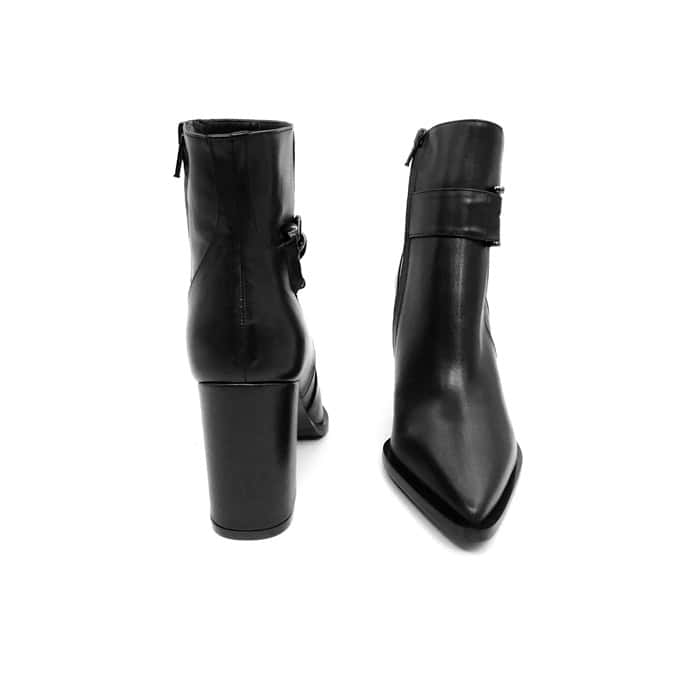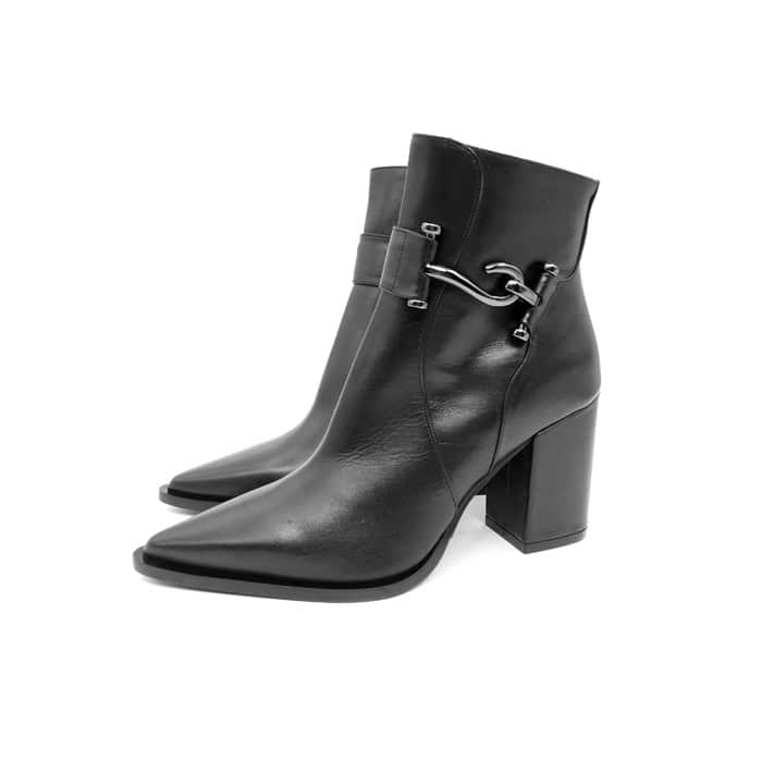 Tronchetto in vitello nero con accessorio gancio metallico. Zip laterale. Interno in pelle. Tacco 8 cm.