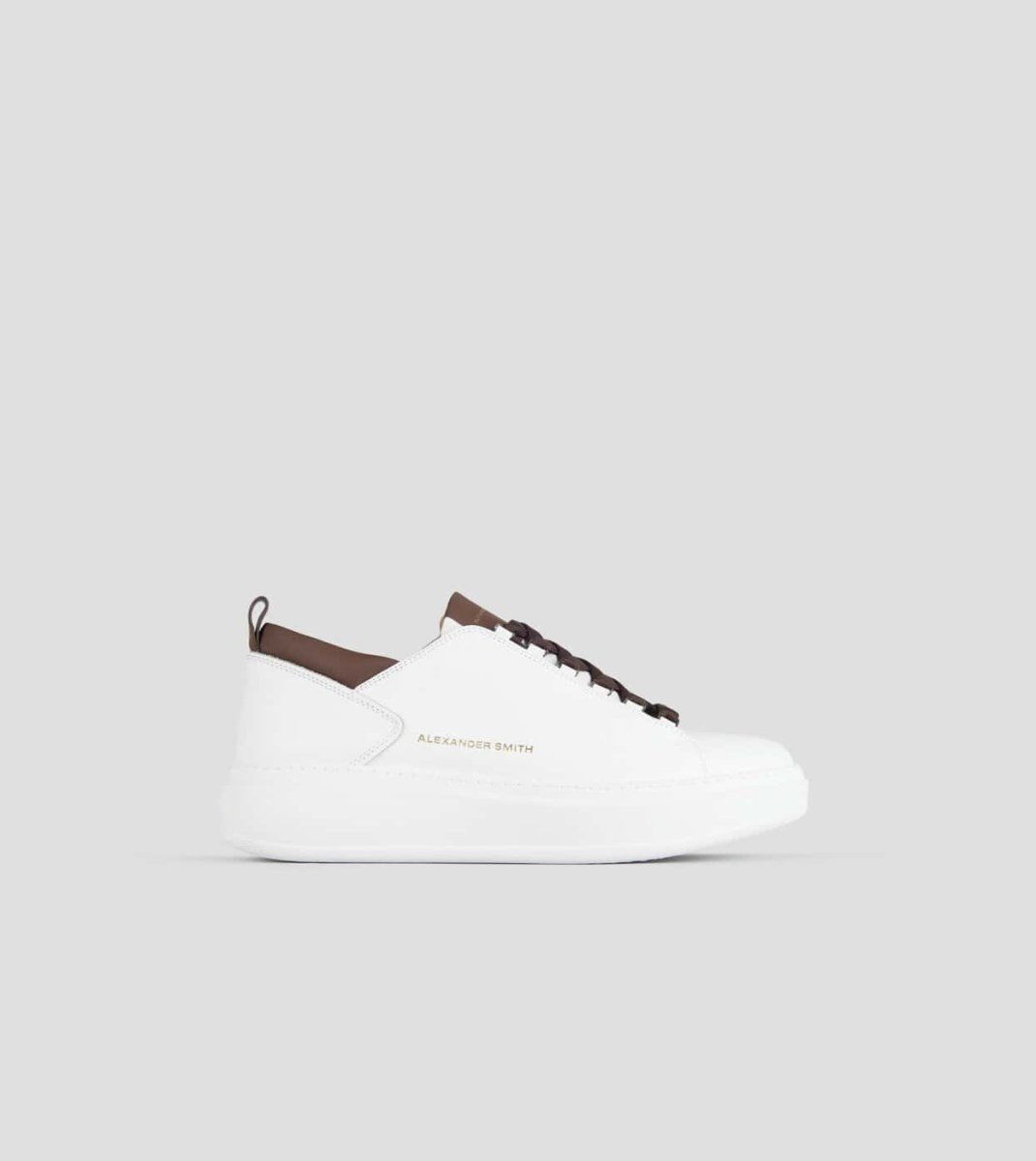 Wembley Uomo in morbida pelle bianca e dettagli marroni. Logo a lato e nel loop sul retro.ย Soletta interna removibile.ย Suola di 40 mm. Soletta interna di 10 mm.
