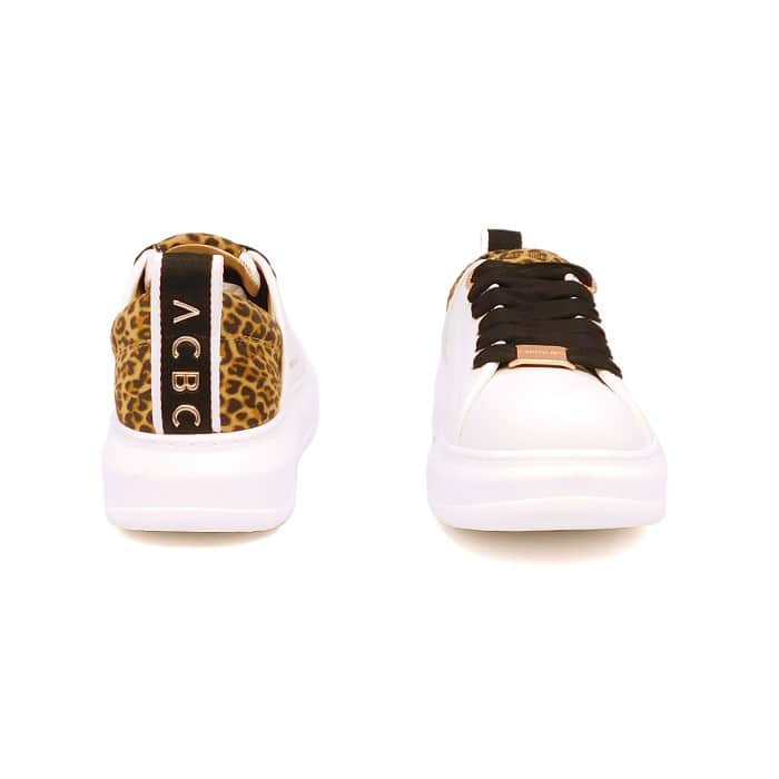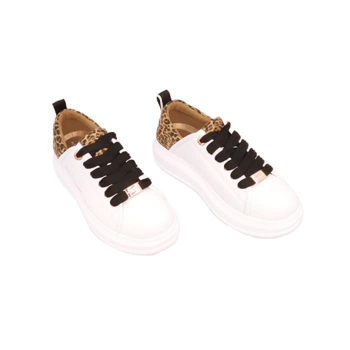Sneaker con tomaia in Free Bioโข. Laccio in cotone nero. Talloncino stampa maculata. Fodera in RePET. Occhiello e passante in metallo ramato. Suola interna in ReFoam removibile. Plateau esterno di 45 mm. Plateau interno di 10 mm. Modello Eco Wembley.