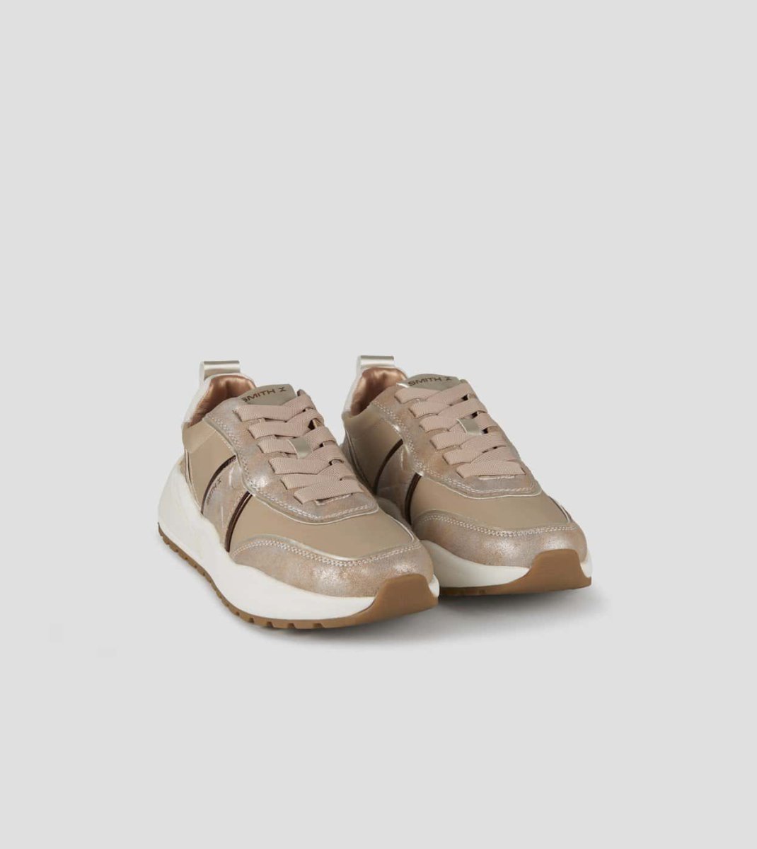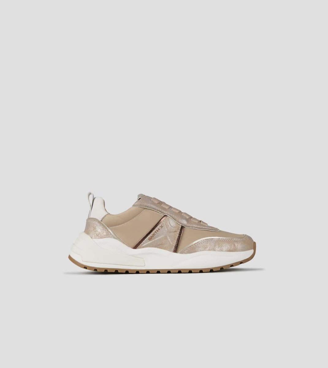 Tomaia in nylon e laminato. Logo laterale. Suola running. Suola 40 mm. Soletta interna 10 mm. Sneakers in nylon avorio e laminato polveroso oro.