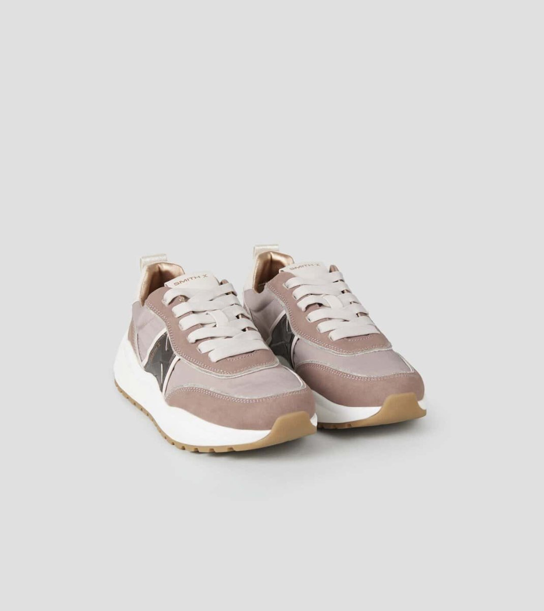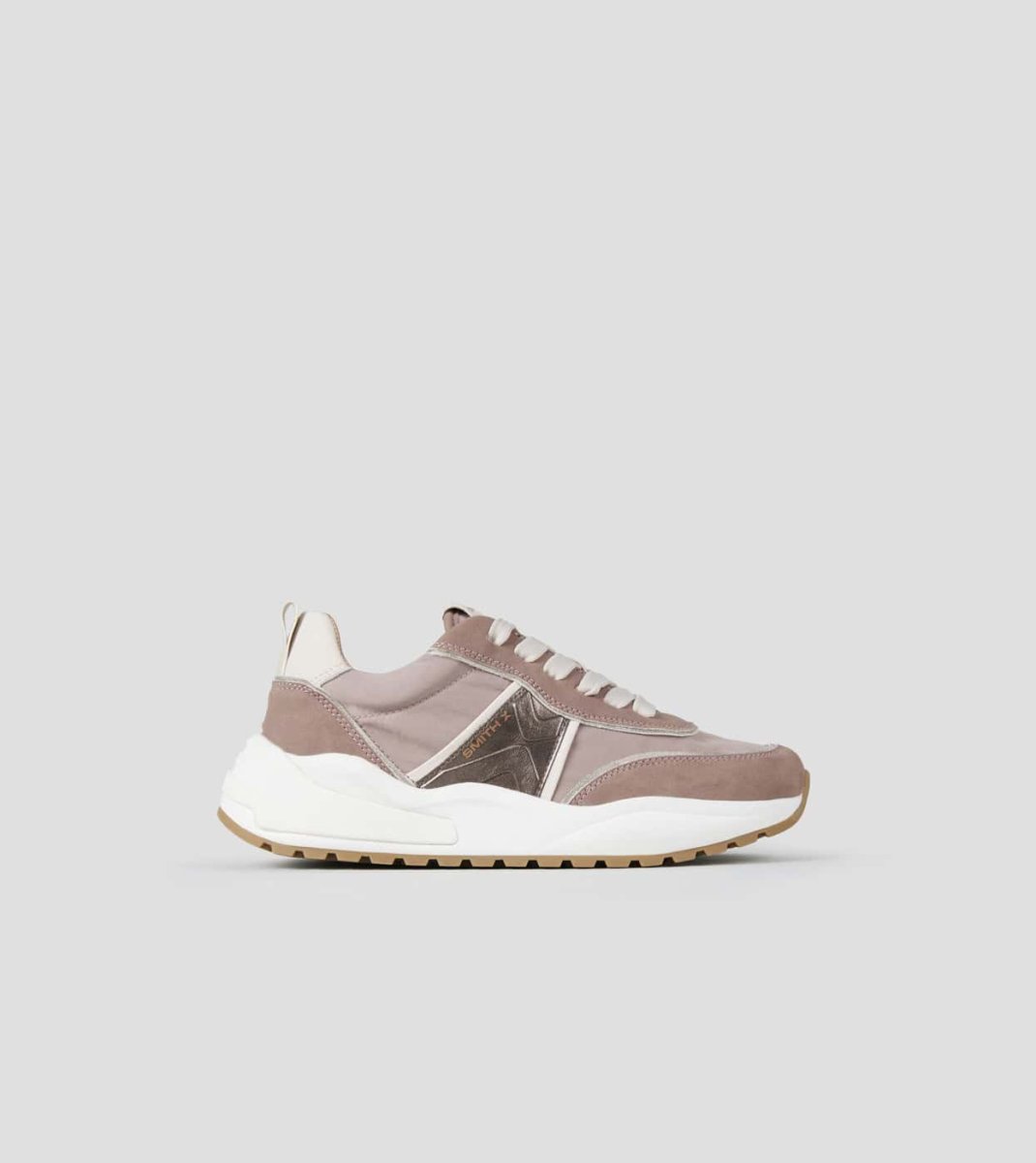 Tomaia in nylon e laminato. Logo laterale. Suola running. Suola 40 mm. Soletta interna 10 mm. Sneakers in nylon rosa e dettagli in laminato bronzo.