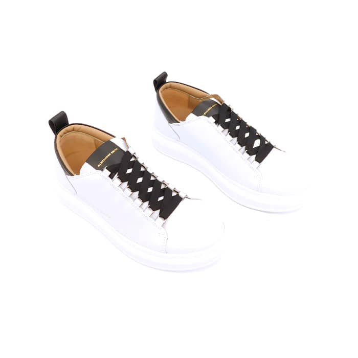 Sneaker con tomaia in pelle e inserti in contrasto nero. Logo sul tirante posteriore in pelle e sul fianco. Suola interna estraibile in pelle. Modello Wembley. Suola esterna di 40 mm e soletta interna di 20mm. Made in Italy.