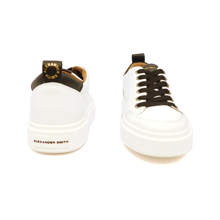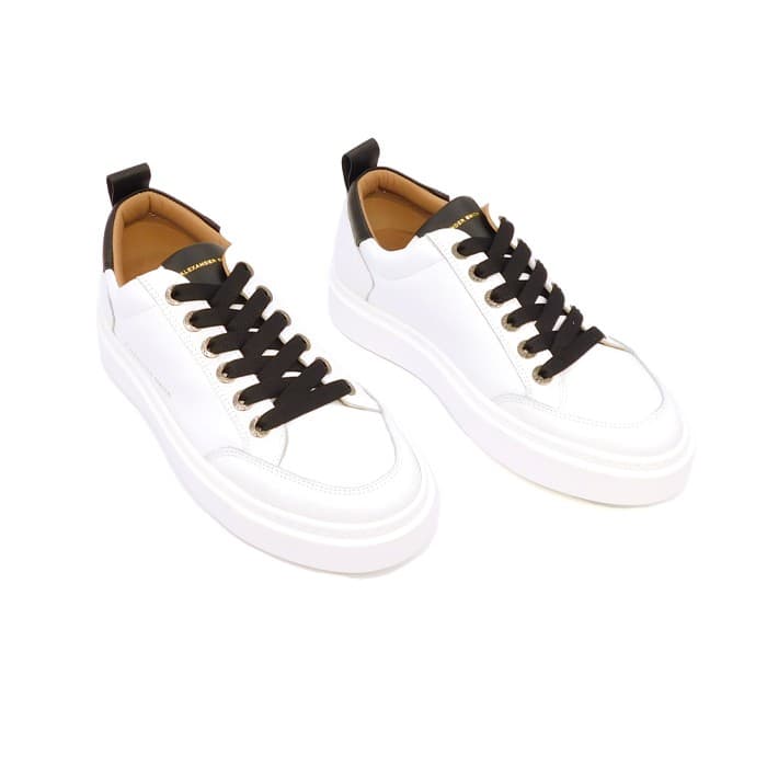 Sneaker in vitello bianca con lacci e talloncino neri a contrasto. Interno in pelle. Soletta interna removibile. Fondo in gomma. Modello Bond. Made in Italy.