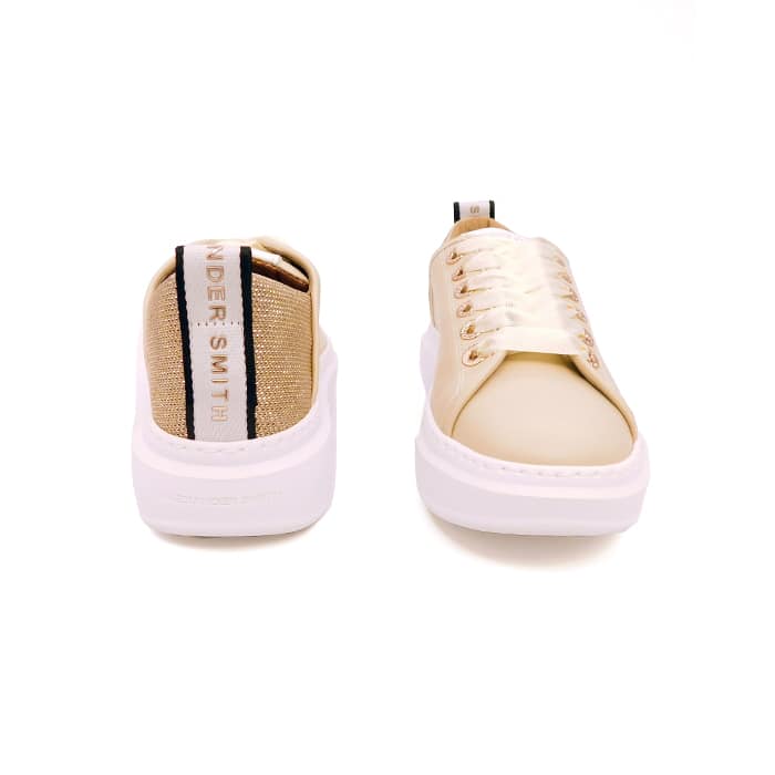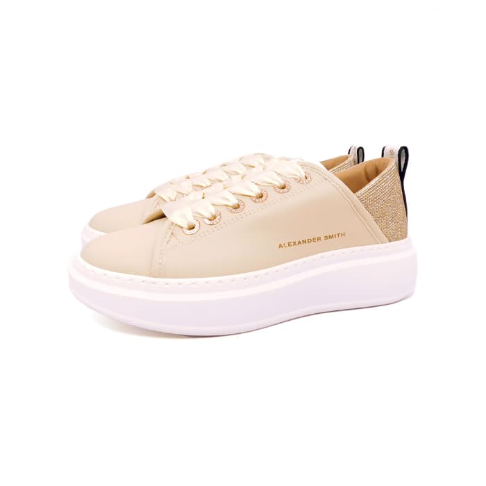 Sneaker con tomaia in pelle sabbia/oro. Logo a lato e nel loop sul retro. Talloncino applicazioni rame. Soletta interna removibile. Suola di 40 mm. Soletta interna di 10 mm. Made in Italy.