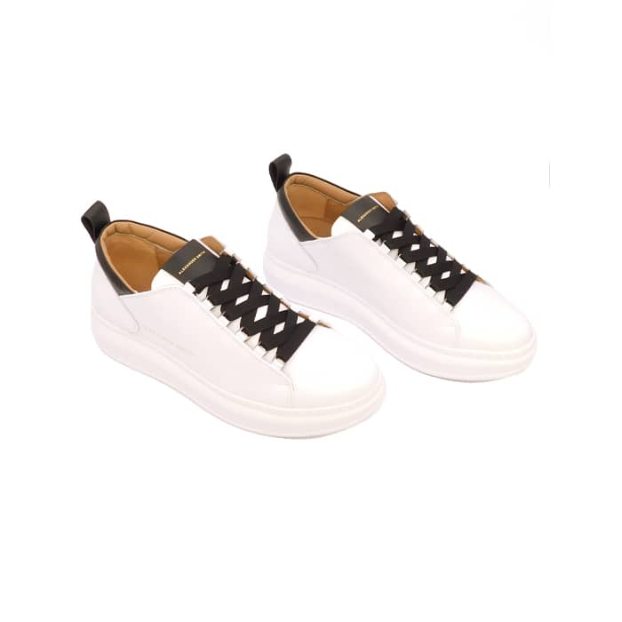 Sneaker con tomaia in pelle e inserti in contrasto nero. Logo sul tirante posteriore in pelle e sul fianco. Suola interna estraibile in pelle. Modello Wembley. Suola esterna di 40 mm e soletta interna di 20mm. Made in Italy.