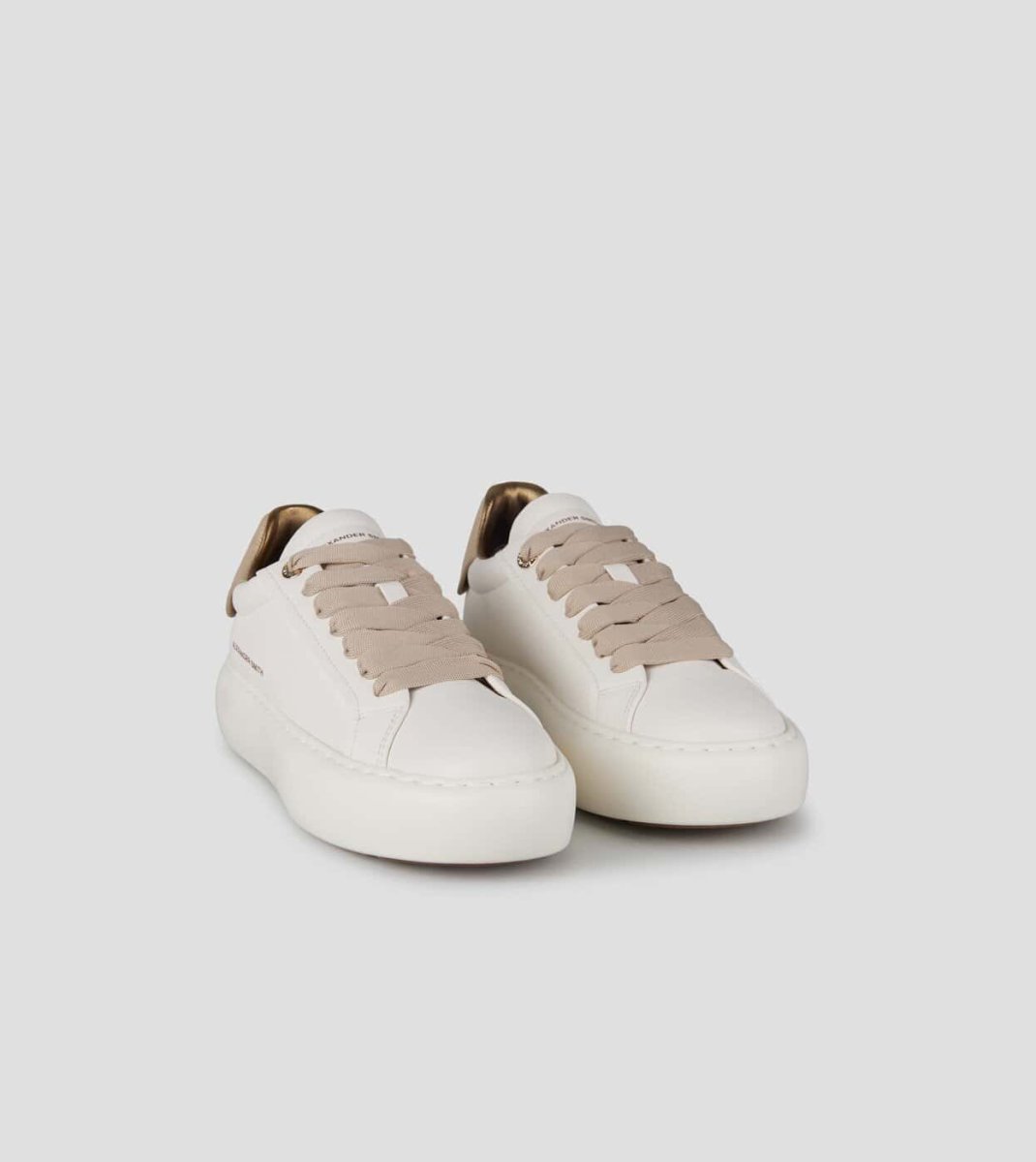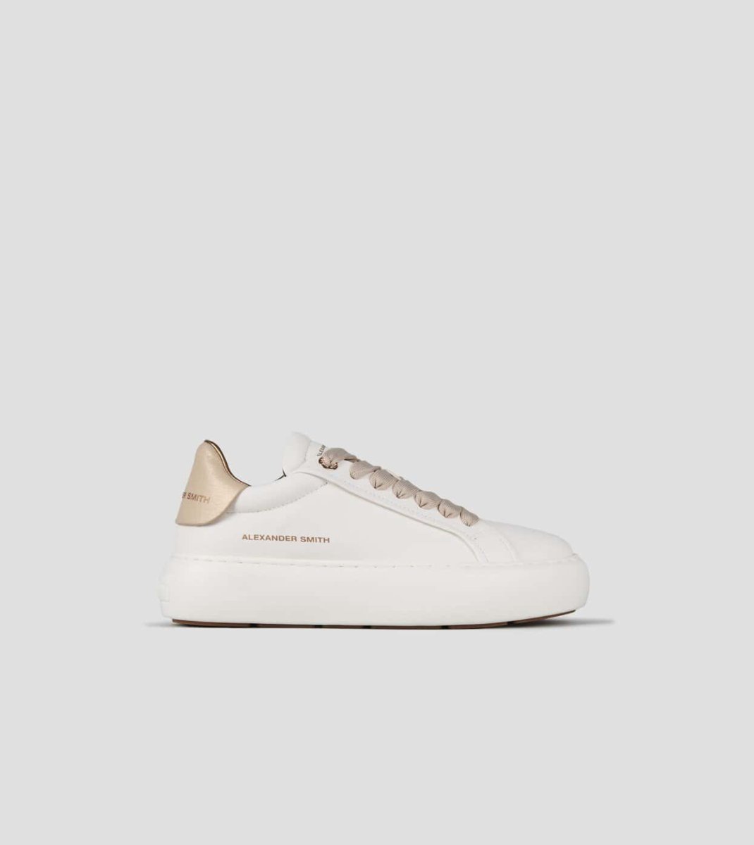 Tomaia in pelle. Occhielli oro rosa. Logo sul retro e a lato.ย Soletta interna removibile.ย Suola di 40 mm. Soletta interna di 10 mm. Sneakers in morbida pelle bianca e tallone cracklรจ laminato oro.