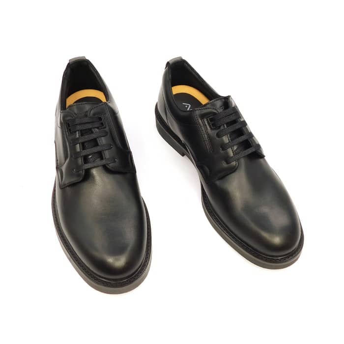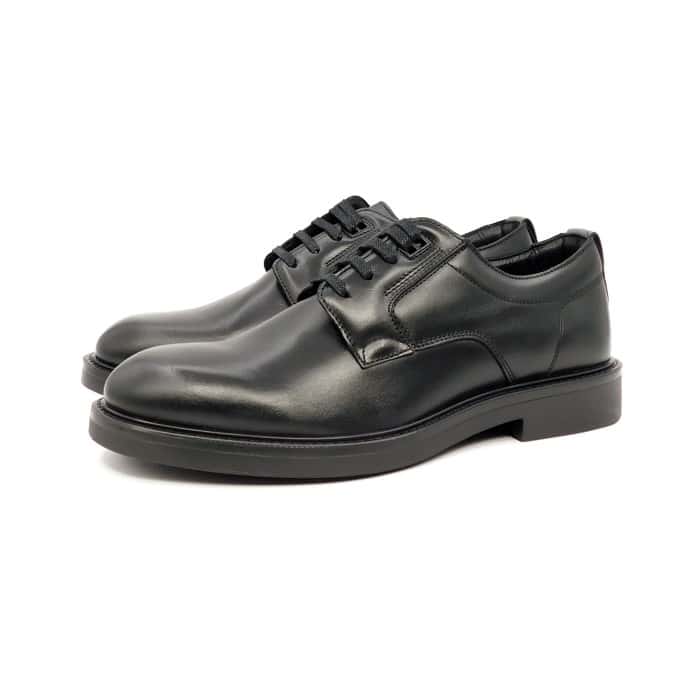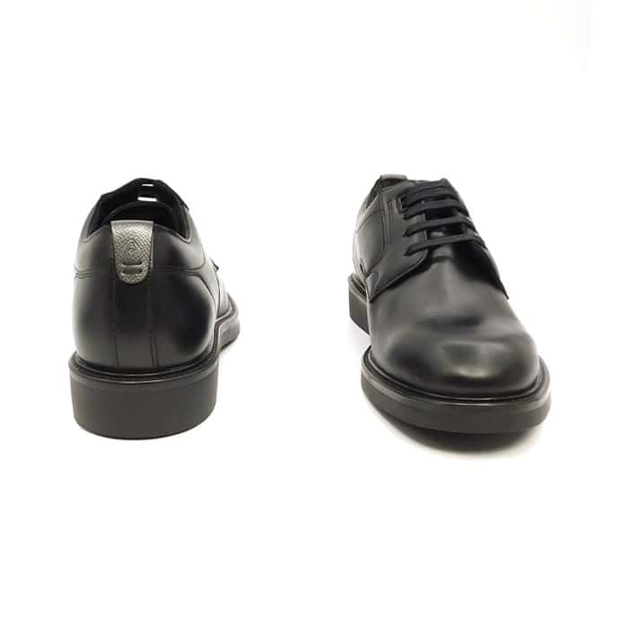Scarpa in vitello nero con allacciatura derby. Interno in pelle. Fondo in gomma.