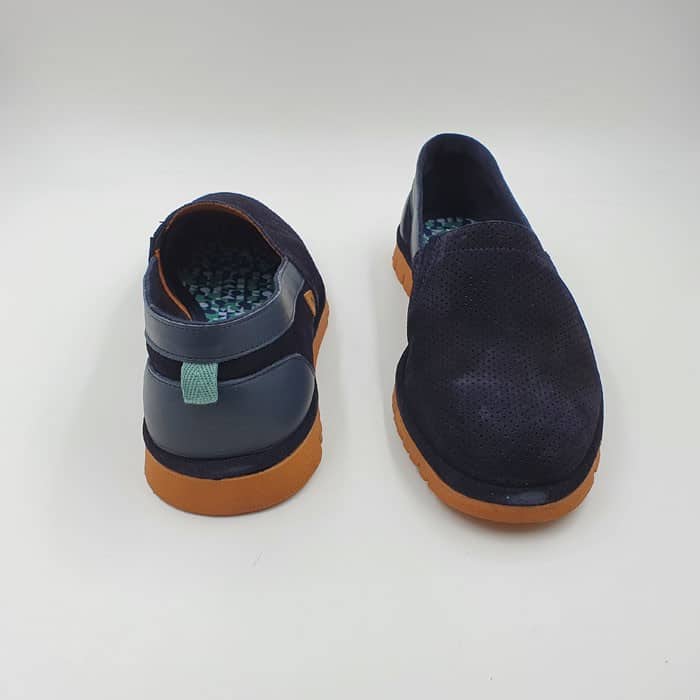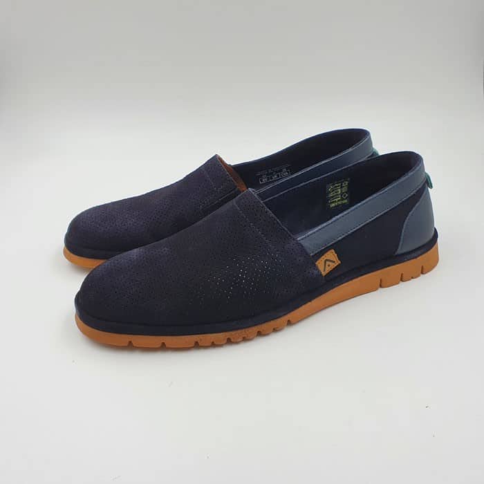 Pantofola in camoscio forato. Interno in pelle. Fondo in gomma.