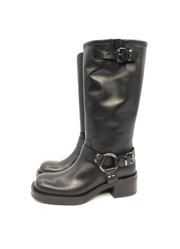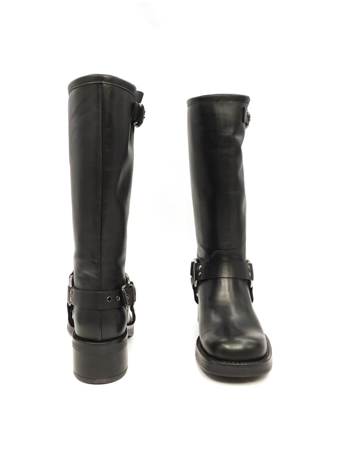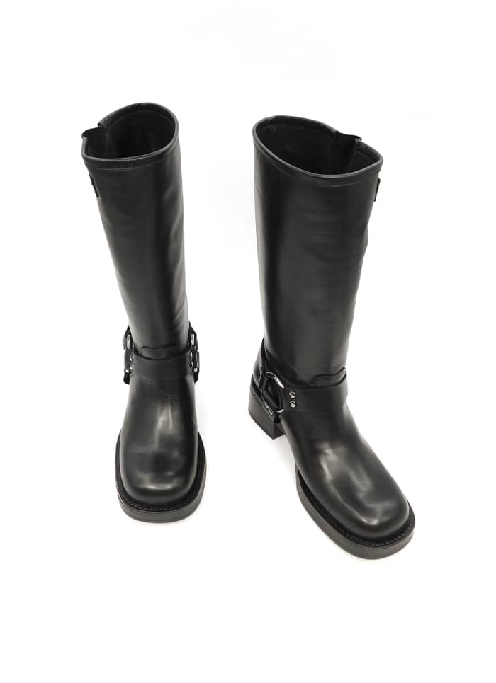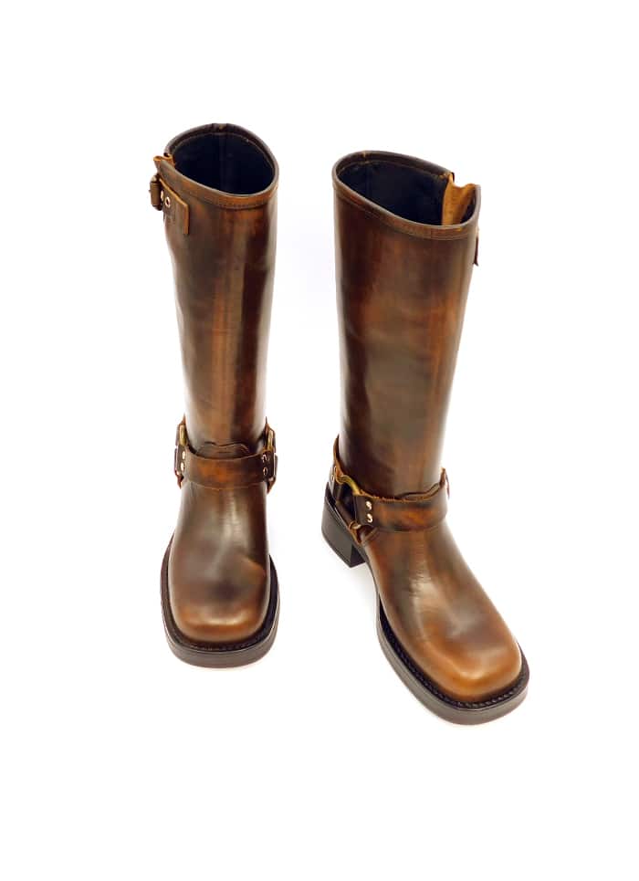 Stivale frye in vitello con fibbia sul gambale e staffa. Interno in pelle. Fondo in gomma.