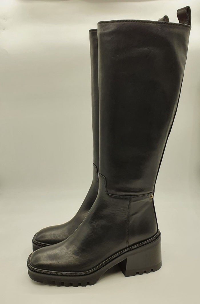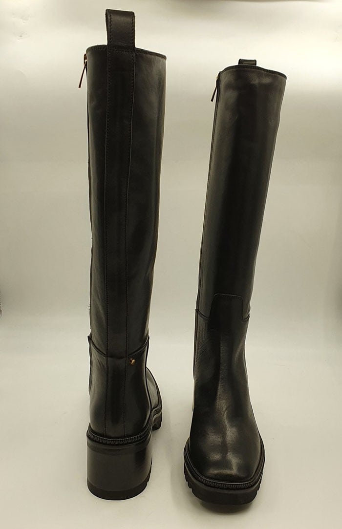 Stivale in vitello nero con zip laterale. Interno in pelle. Fondo carrarmato in gomma. Tacco 5 cm.