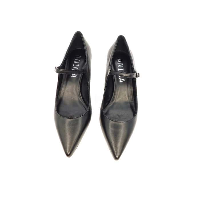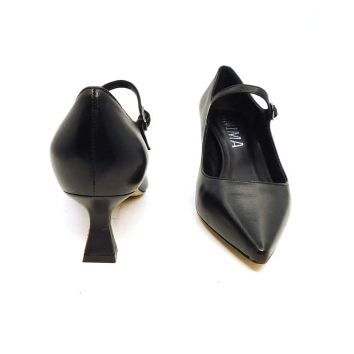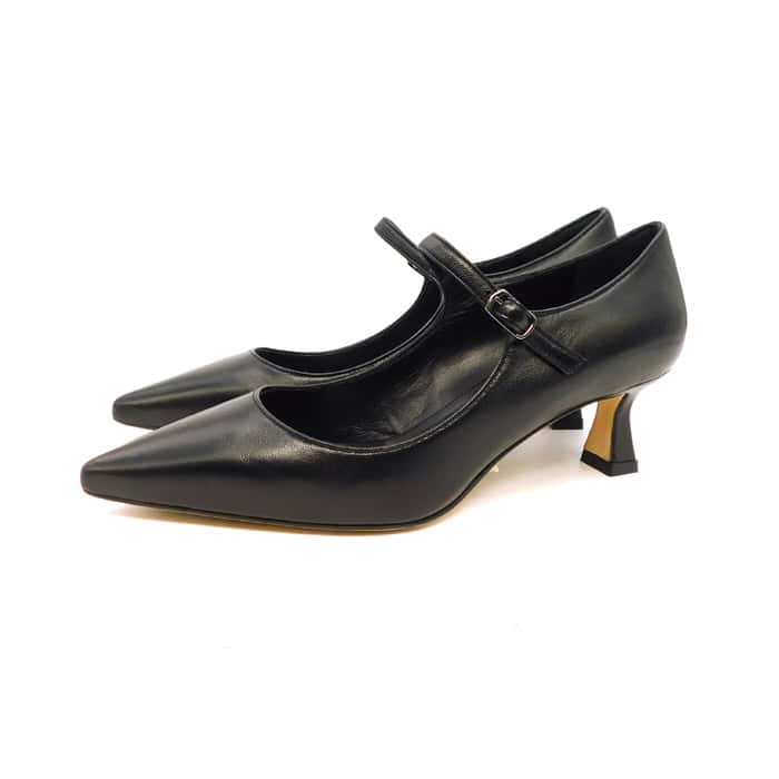 Mary-Jane in vitello con cinturino regolabile. Interno in pelle. Tacco a rocchetto 5 cm. Fondo in cuoio.