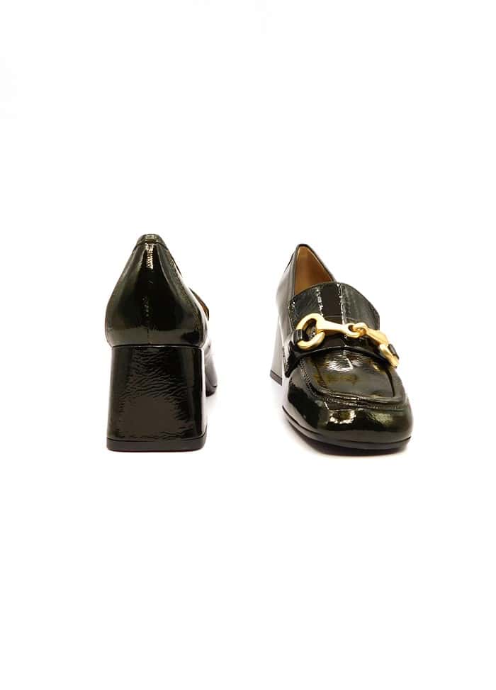 Mocassino in pelle effetto vernice e morsetto. Interno in pelle. Tacco 5 cm. Fondo in cuoio.