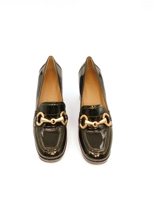 Mocassino in pelle lucida con morsetto. Interno in pelle. Tacco 7 cm. Fondo in gomma