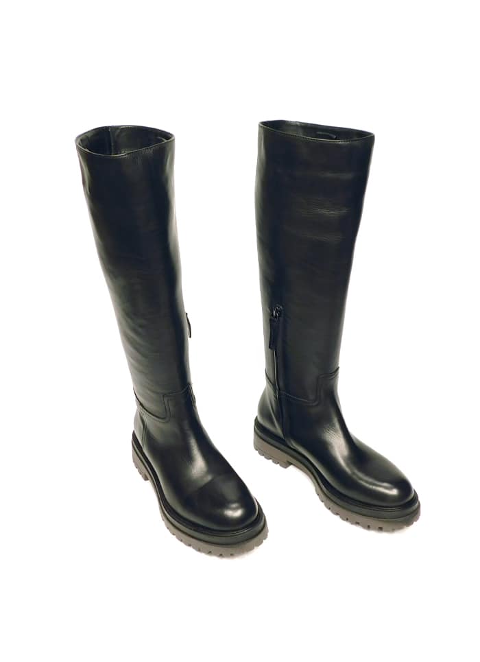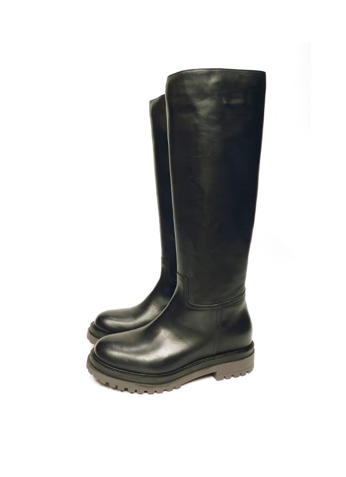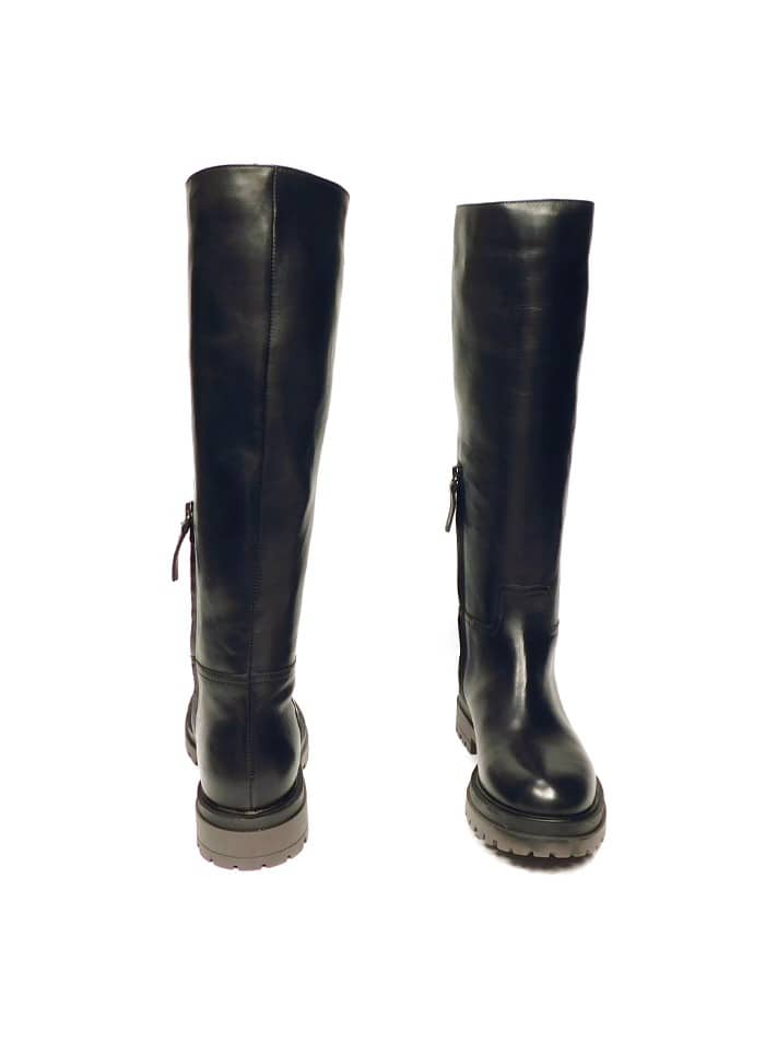 Stivale in vitello nero con gambale alto. Interno in pelle. Fondo carrarmato in gomma.