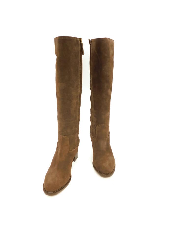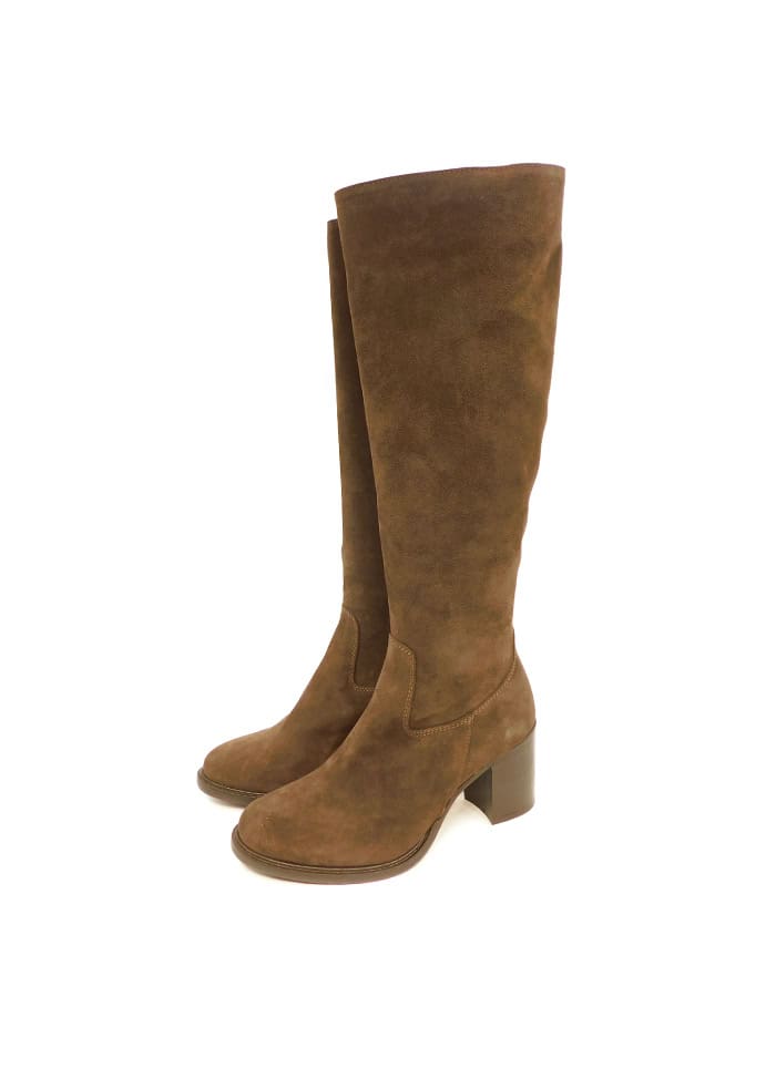 Stivale in camoscio marrone con punta stondata. Interno in pelle. Tacco 7 cm. Zip laterale. Fondo in gomma. Made in Italy.