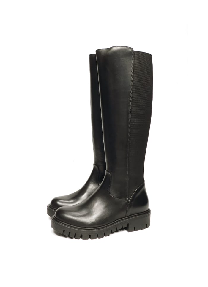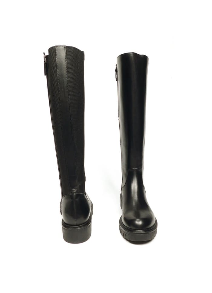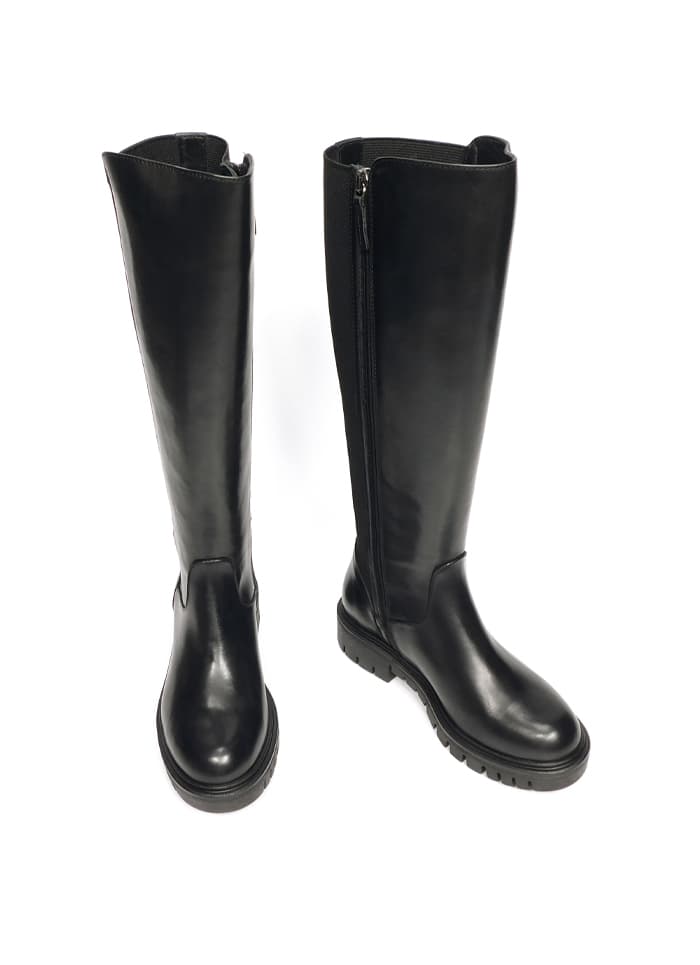 Stivale in vitello nero con inserto elastico. Gambale alto al ginocchio. Interno in pelle. Fondo in gomma.
