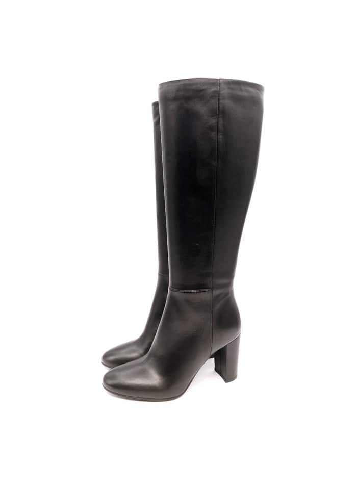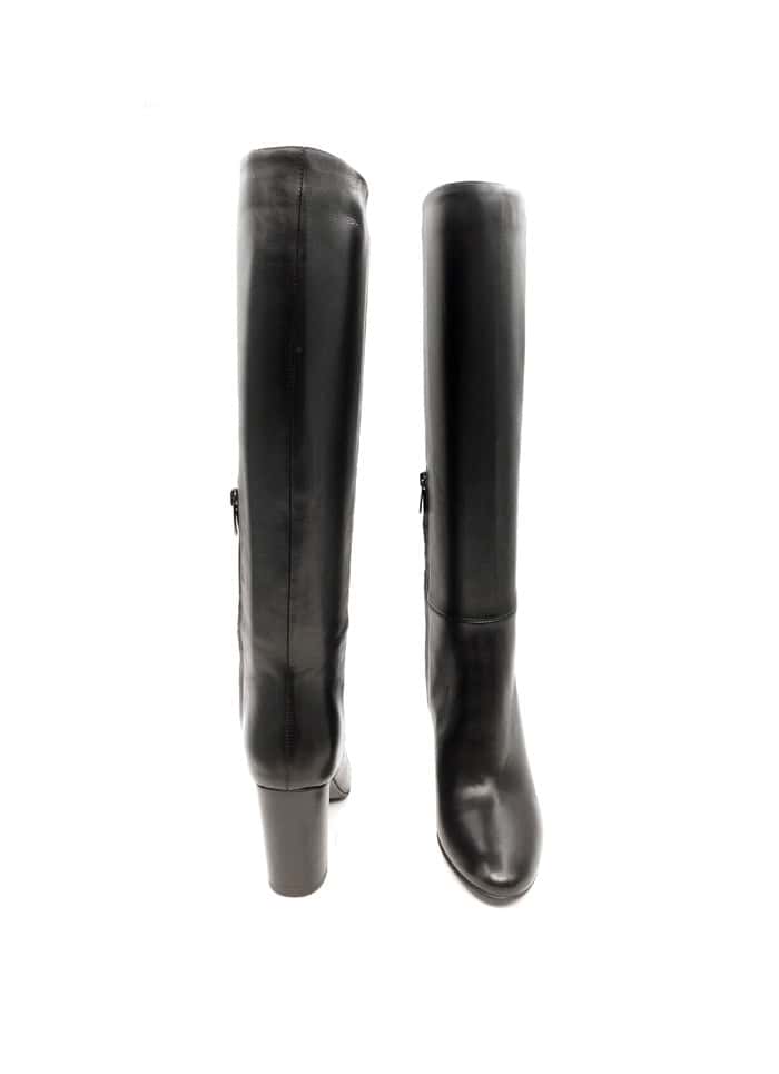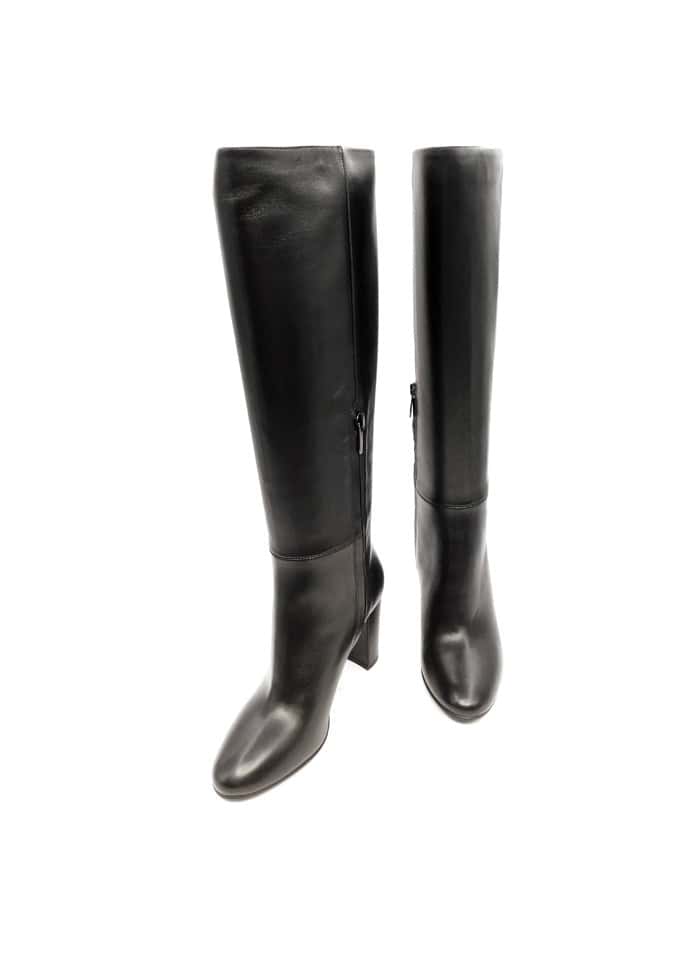 Stivale in vitello nero con punta stondata. Interno in pelle. Gambale con mezza zip. Tacco 8 cm.