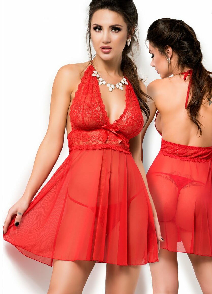 Seducente babydoll in microrete rossa con coppe e fascia in pizzo ricamato, con fiocco in raso rosso. Legatura al collo tramite due fettucce elastiche.Puรฒ essere usata come intimo notte. Compreso nella confezione il perizoma in microrete coordinato al babydoll.