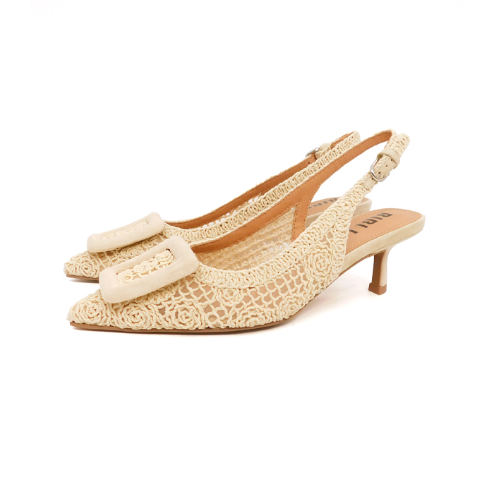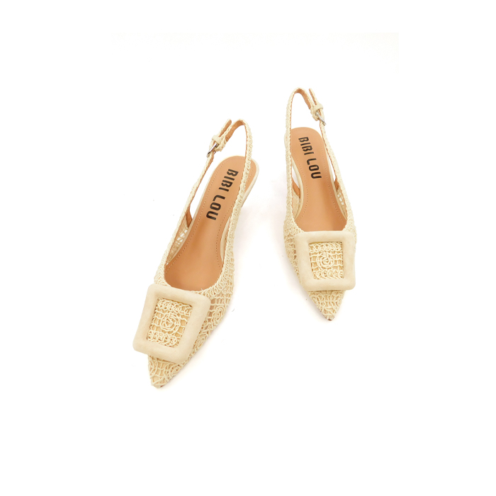 Chanel in camoscio beige e ricamo. Accessorio fibbia. Interno in pelle. Tacco 5 cm.