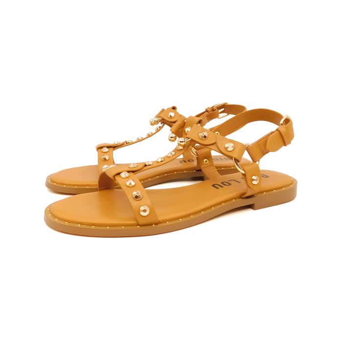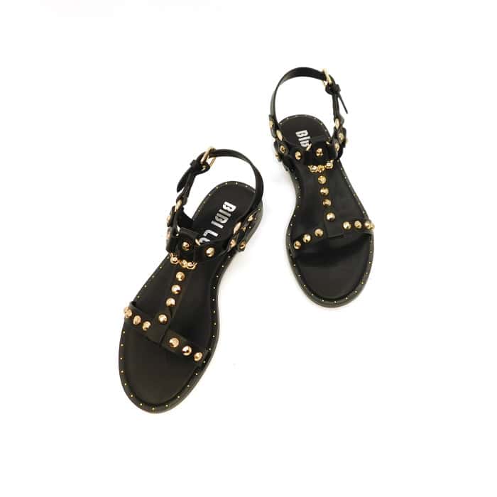 Sandalo flat con cinturino e applicazione borchiette. Interno in pelle. Fondo in gomma.