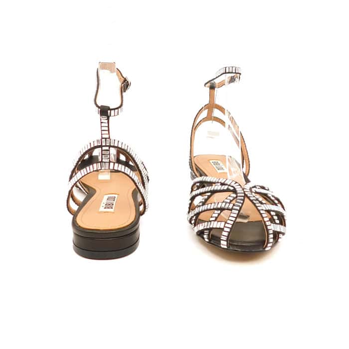 Sandalo in vitello con applicazioni specchietti rettangolari. Cinturino alla caviglia. Interno in pelle. Tacco 1 cm.