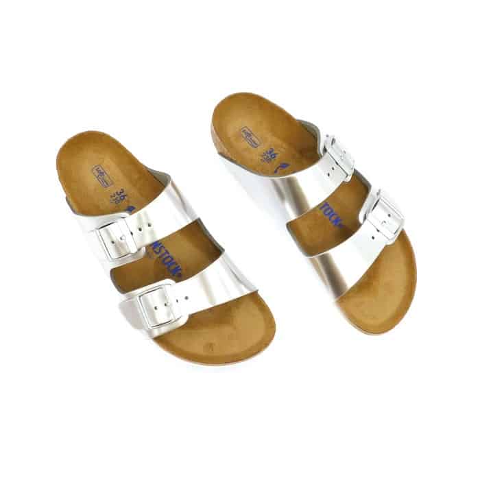 Ciabatta in Birko-Florยฎ argento. Plantare anatomico in sughero e lattice. Sottopiede: pelle scamosciata. Suola: EVA.