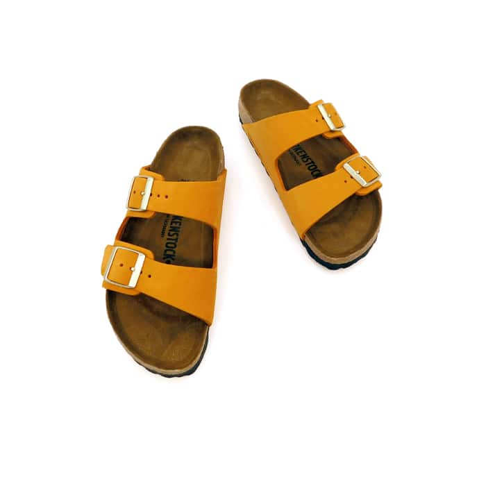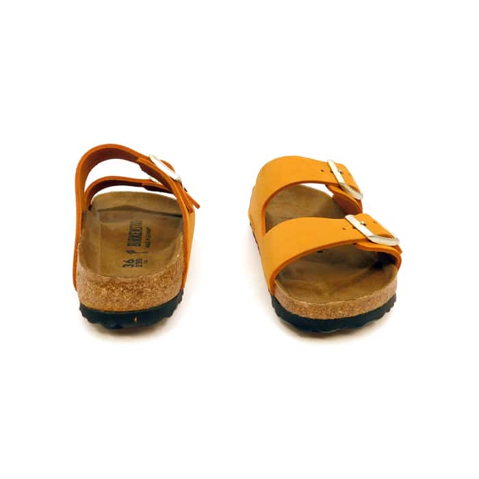 Ciabatta in nubuck arancio. Plantare anatomico in sughero e lattice. Sottopiede: pelle scamosciata. Suola: EVA.