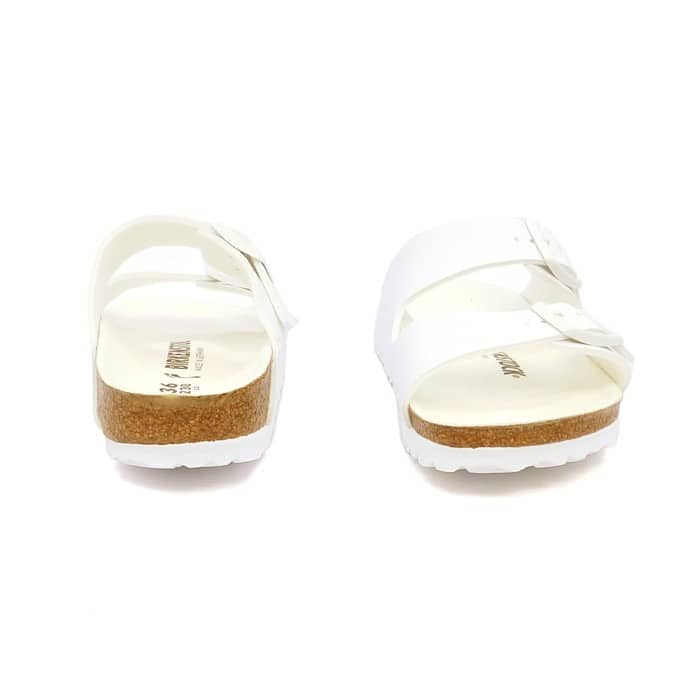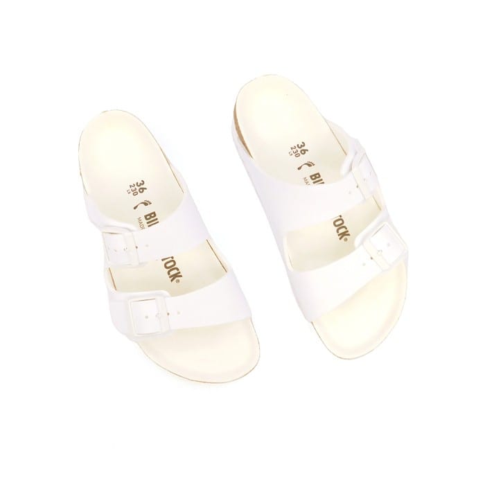Ciabatta in vitello bianco con due fasce. Interno in pelle. Fondo in sughero e gomma.