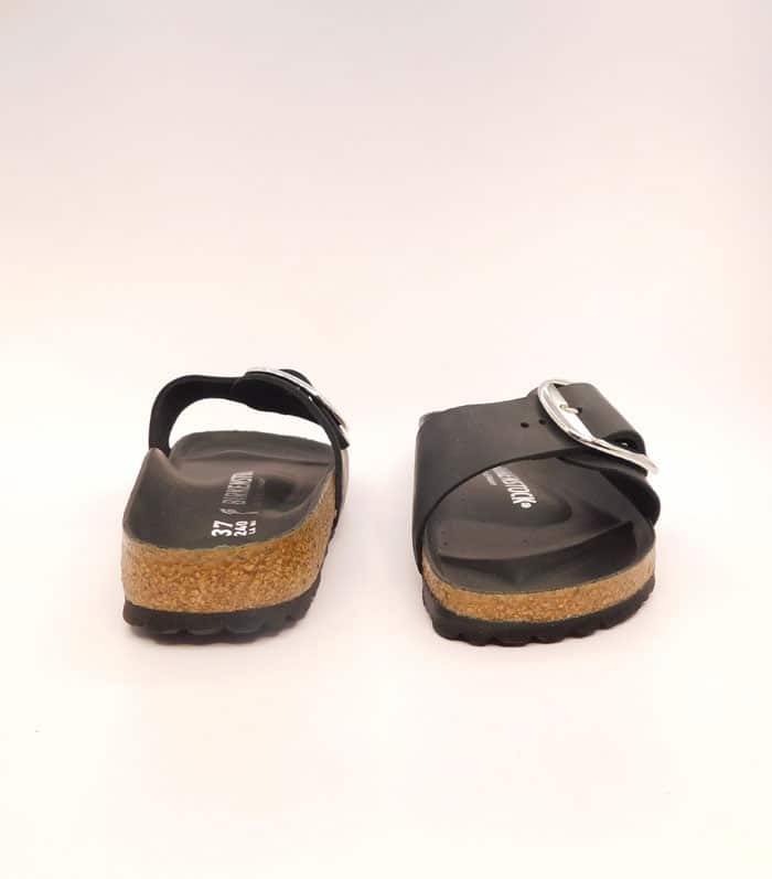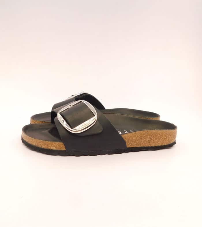 Ciabatta in vitello nero con fibbia. Interno in pelle. Fondo in sughero e gomma.