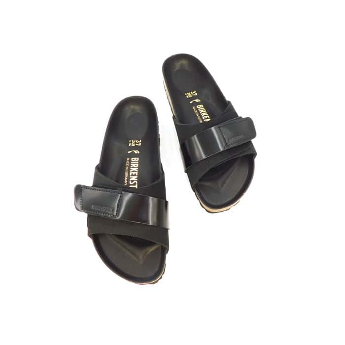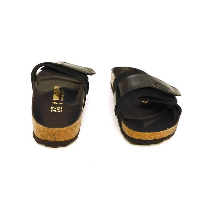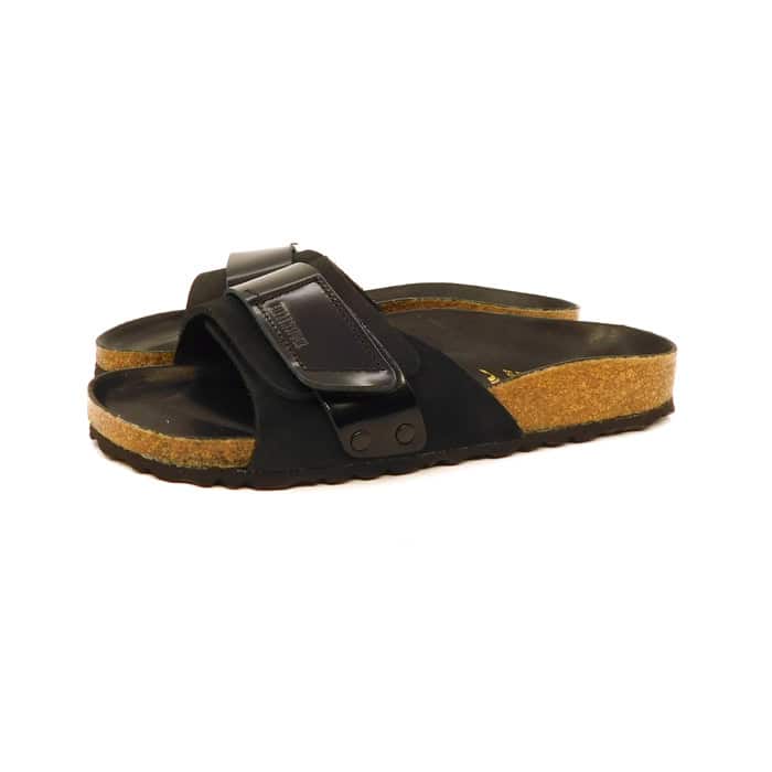 Ciabatta in pelle Nubuck – Black. Plantare anatomico in sughero e lattice; semi-exquisit. Sottopiede: pelle piumato. Suola: EVA. Dettagli: chiusure regolabili individualmente; rivetti decorativi. โMade in Germanyโ.