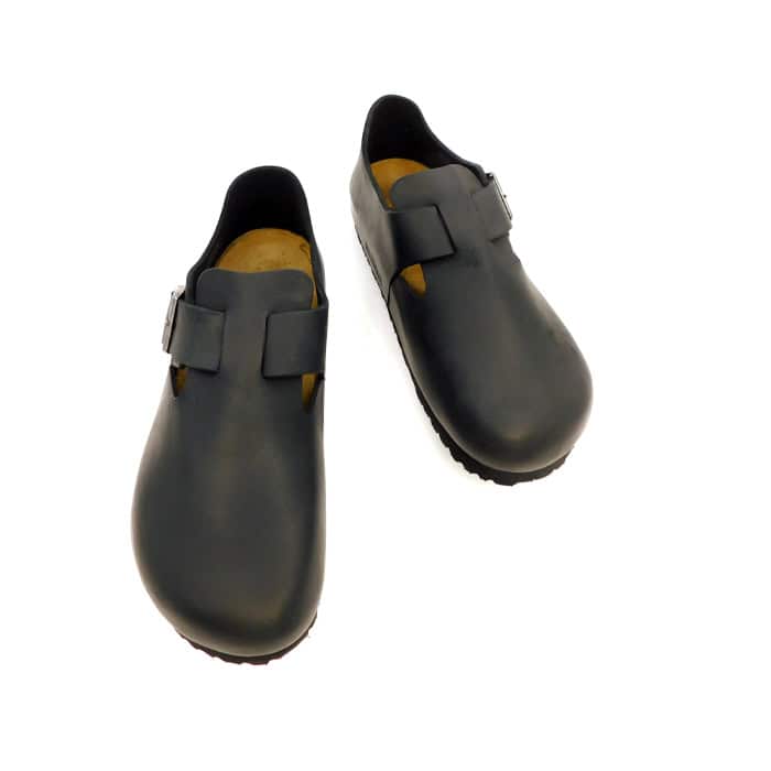 La scarpa bassa London, con la parte del tallone chiusa e alta fino alla caviglia, รจ realizzata in pregiata pelle Nabus oliata. La lavorazione senza fodera e senza bordi sottolinea l’aspetto naturale della calzatura. Plantare dalla forma anatomica. Sottopiede: pelle scamosciata. Suola: EVA. Dettagli: fibbia fissa sul dorso del piede con scritta BIRKENSTOCK impressa.