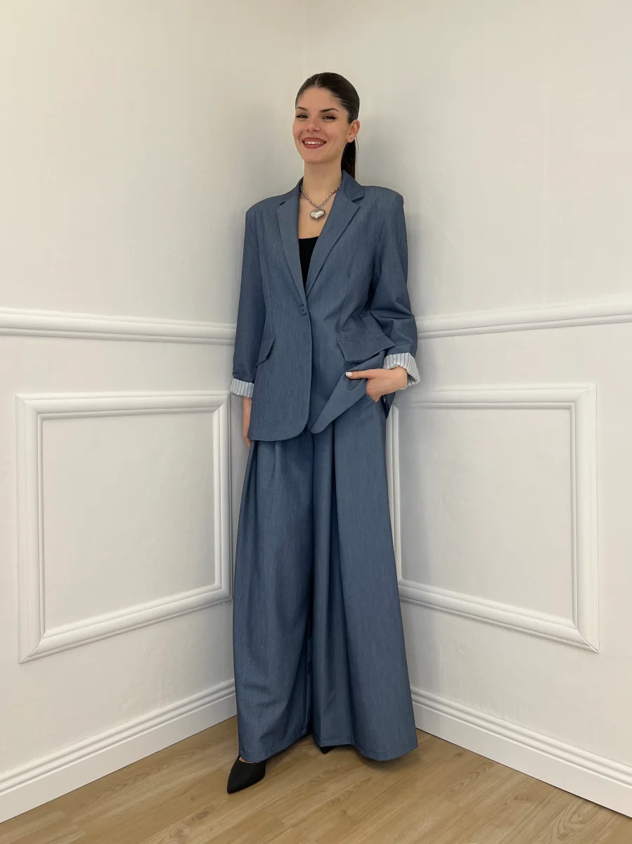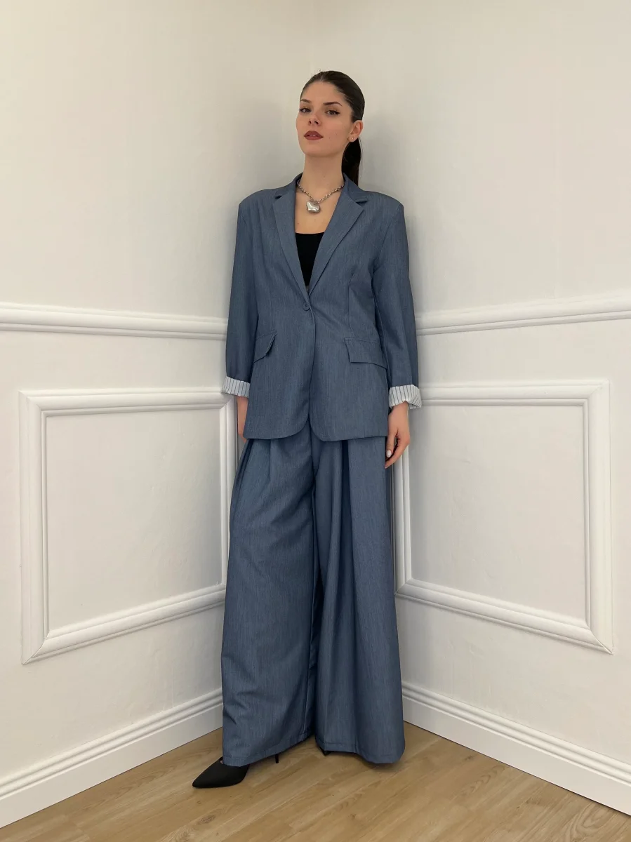 Blazer oversize monopetto coordinato, con finte tasche a patta frontali, spalline rinforzate e dettaglio fodera interna a contrasto in fantasia gessata.
