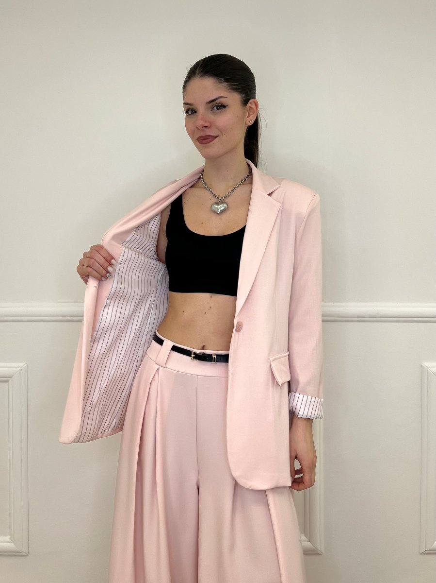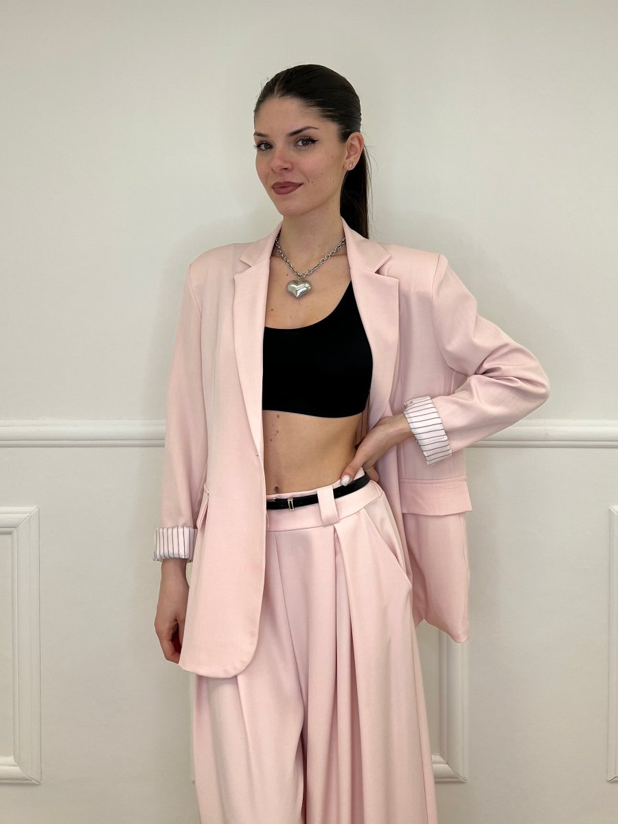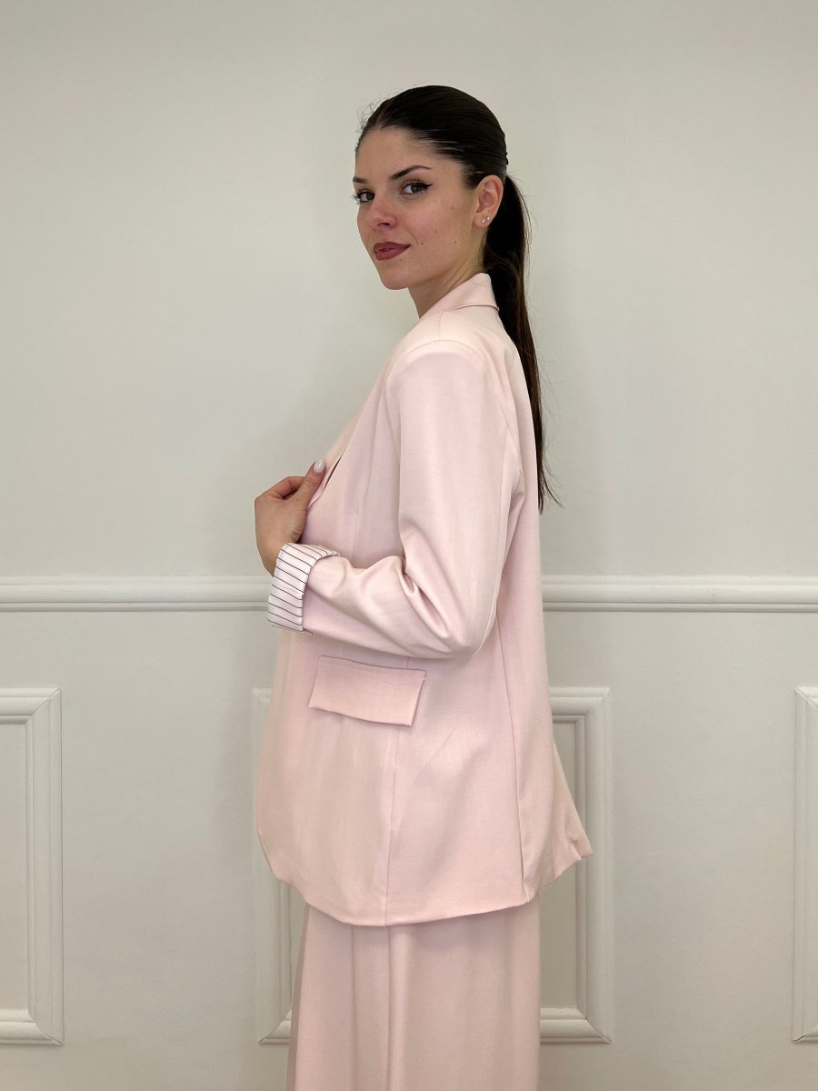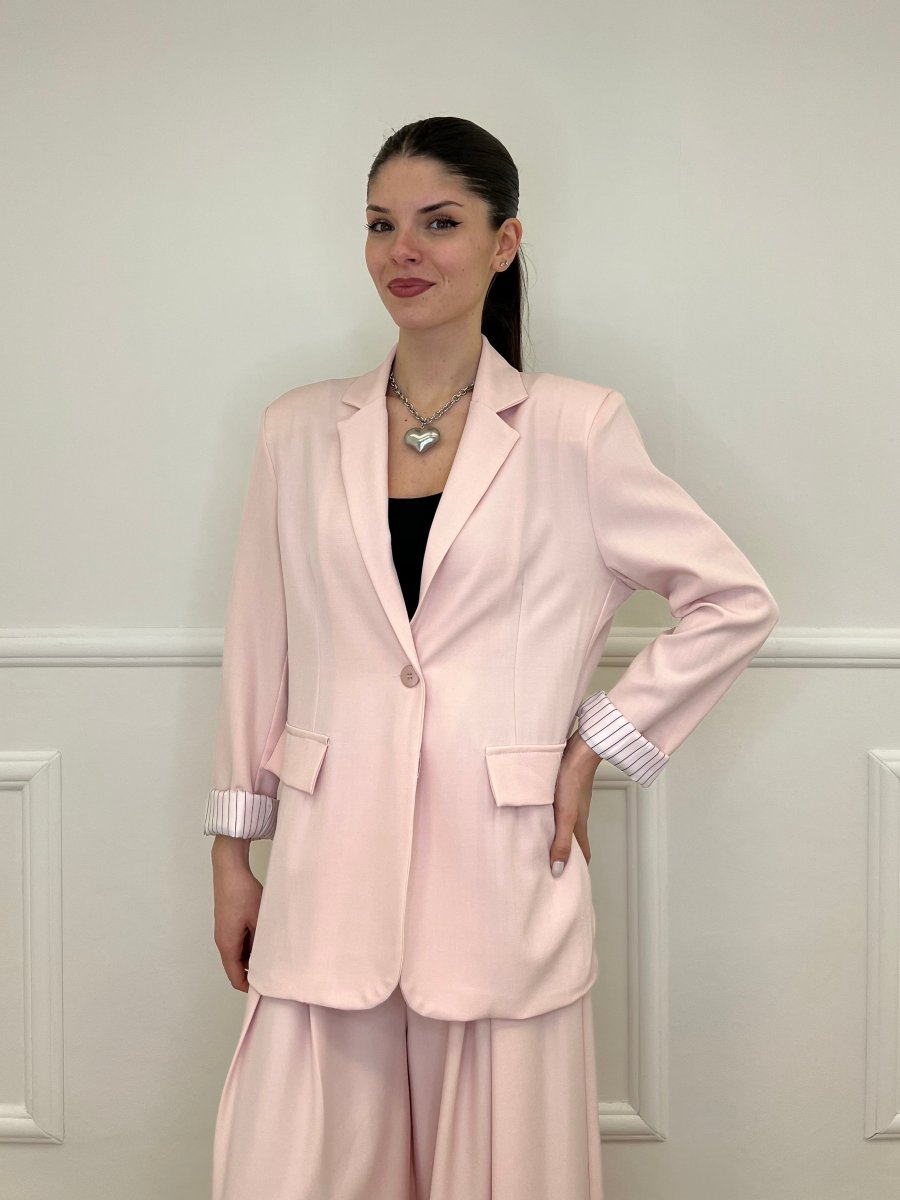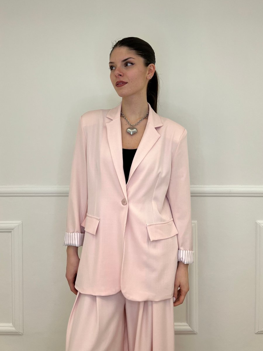 Blazer oversize monopetto coordinato, con finte tasche a patta frontali, spalline rinforzate e dettaglio fodera interna a contrasto in fantasia gessata.