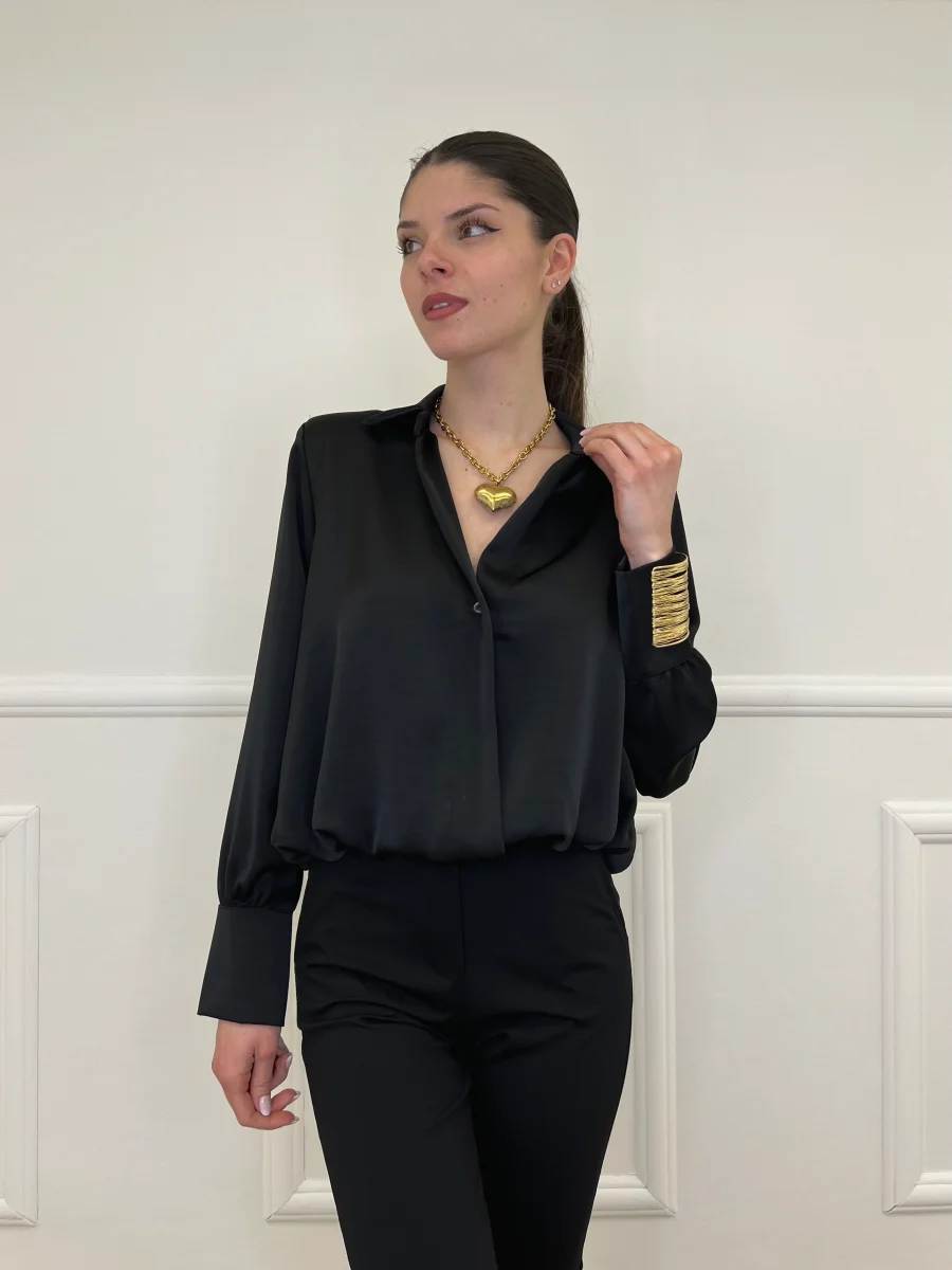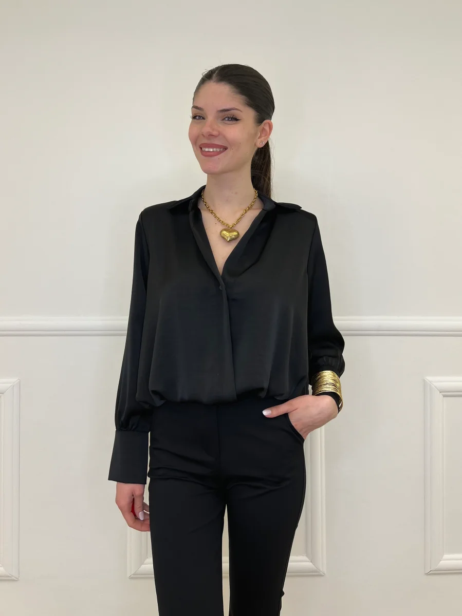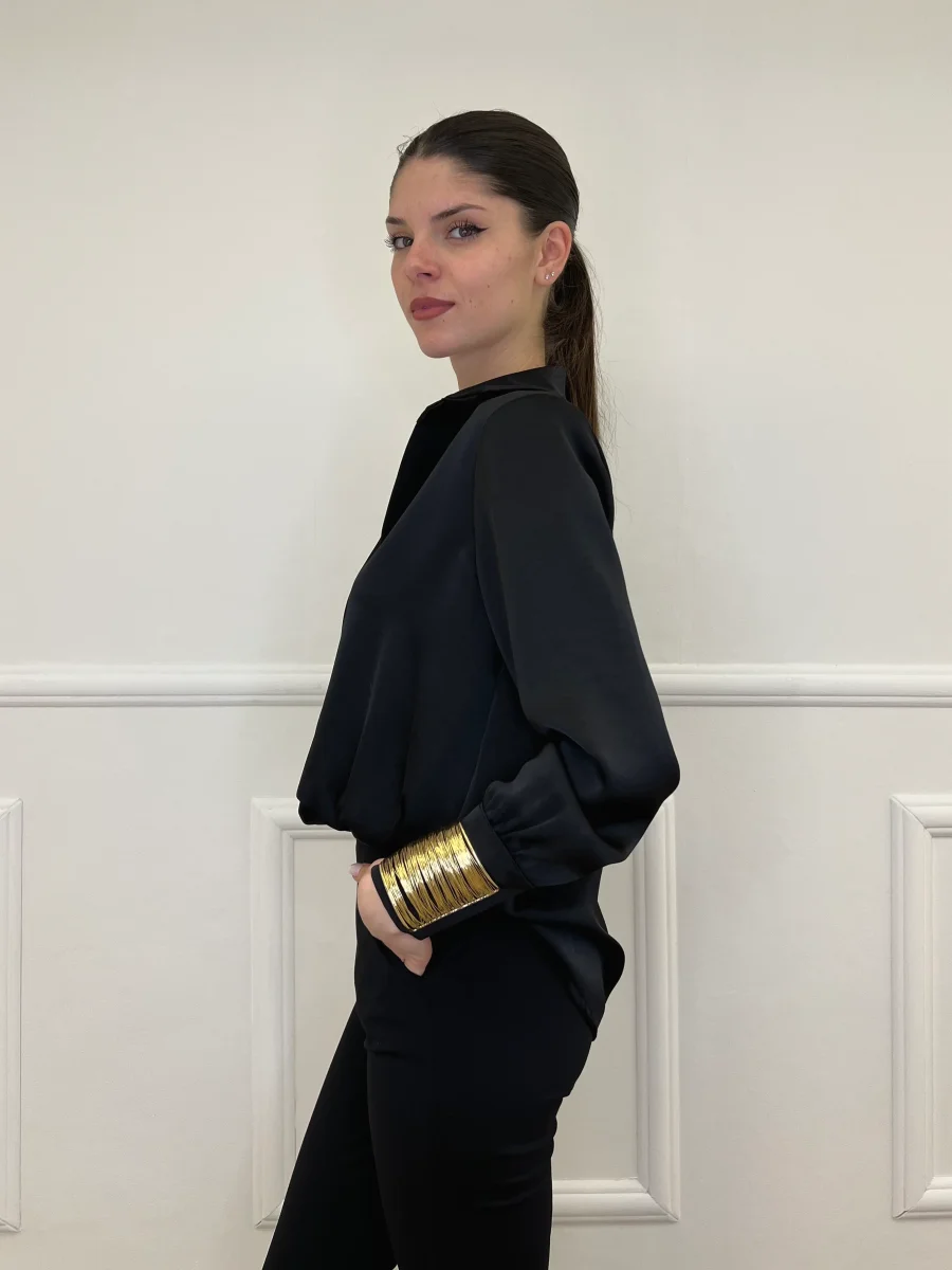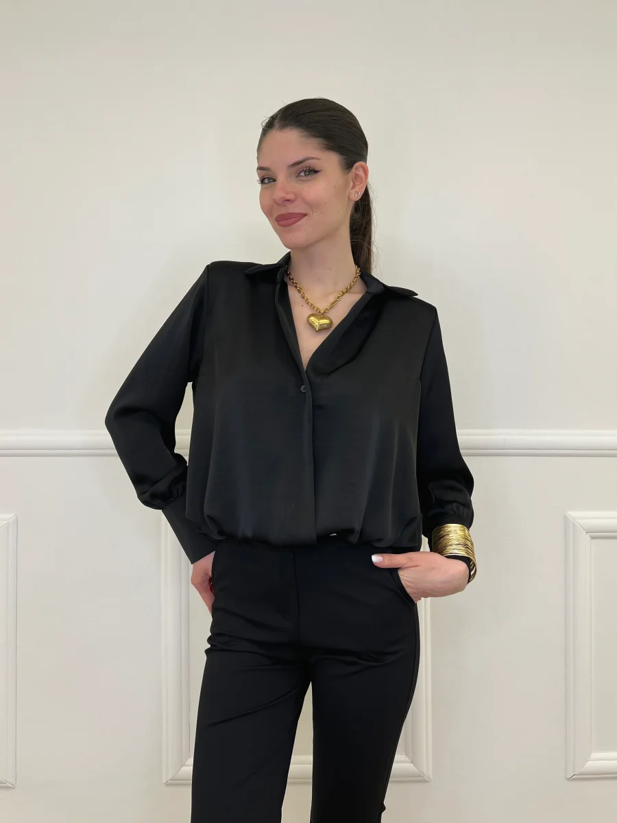Blusa in satin doppio, con spalline rinforzate, scollo derby e maniche a palloncino con polsino ampio. Fondo asimmetrico con elastico frontale.