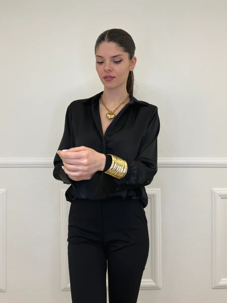Blusa in satin doppio, con spalline rinforzate, scollo derby e maniche a palloncino con polsino ampio. Fondo asimmetrico con elastico frontale. Veste fino tg 46Lunghezza frontale: 56 cmLunghezza posteriore: 67 cm