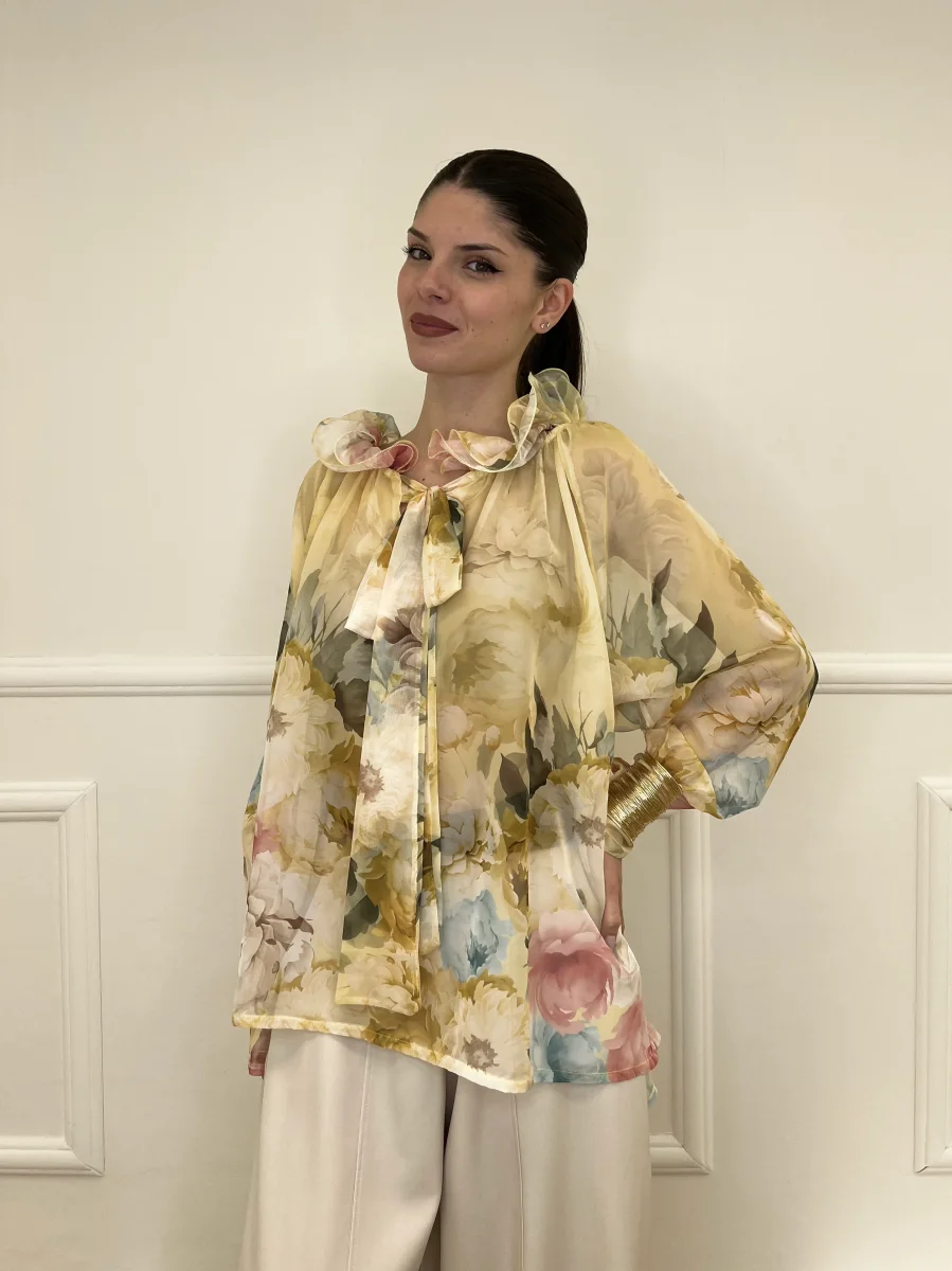 Camicia in voile in fantasia floreale con maniche raglan a palloncino collo con jabot e scollo a V frontale regolabile con fiocco.
