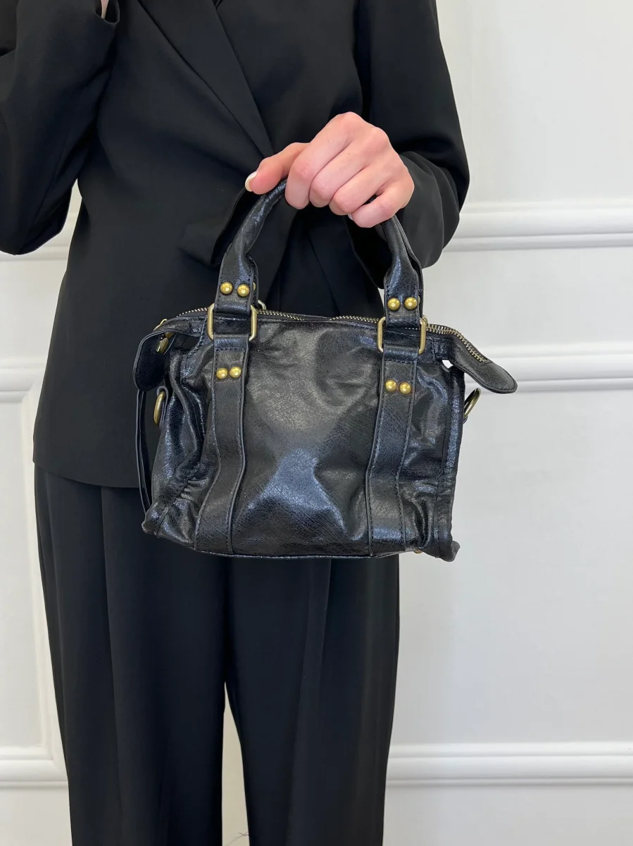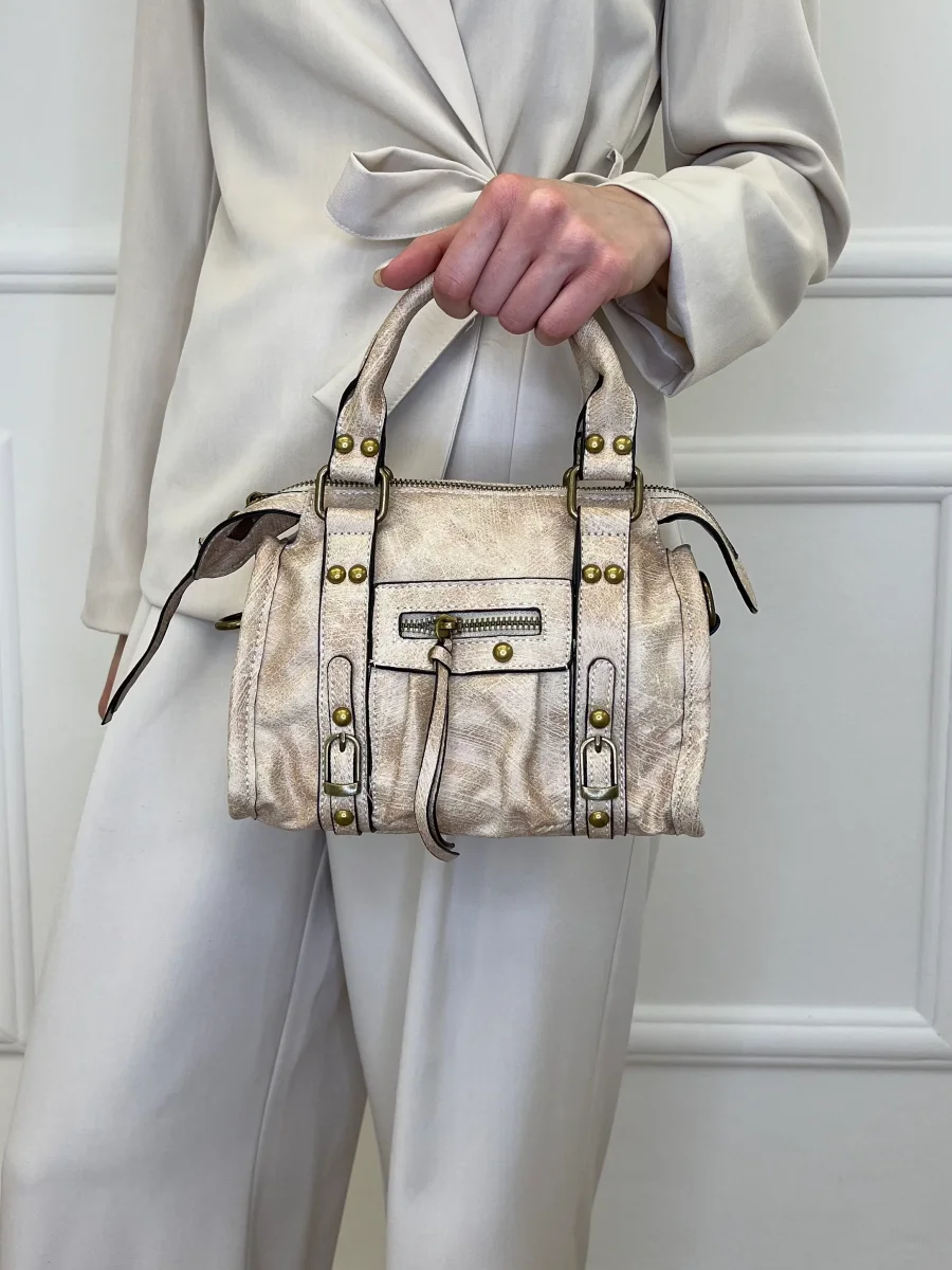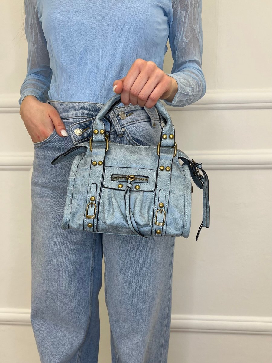 Borsa a mano in tessuto sky (ecopelle spalmata) con doppio manico, chiusura zip dorata con doppio cursore e applicazioni frange e borchie. Include tracolla rimovibile.