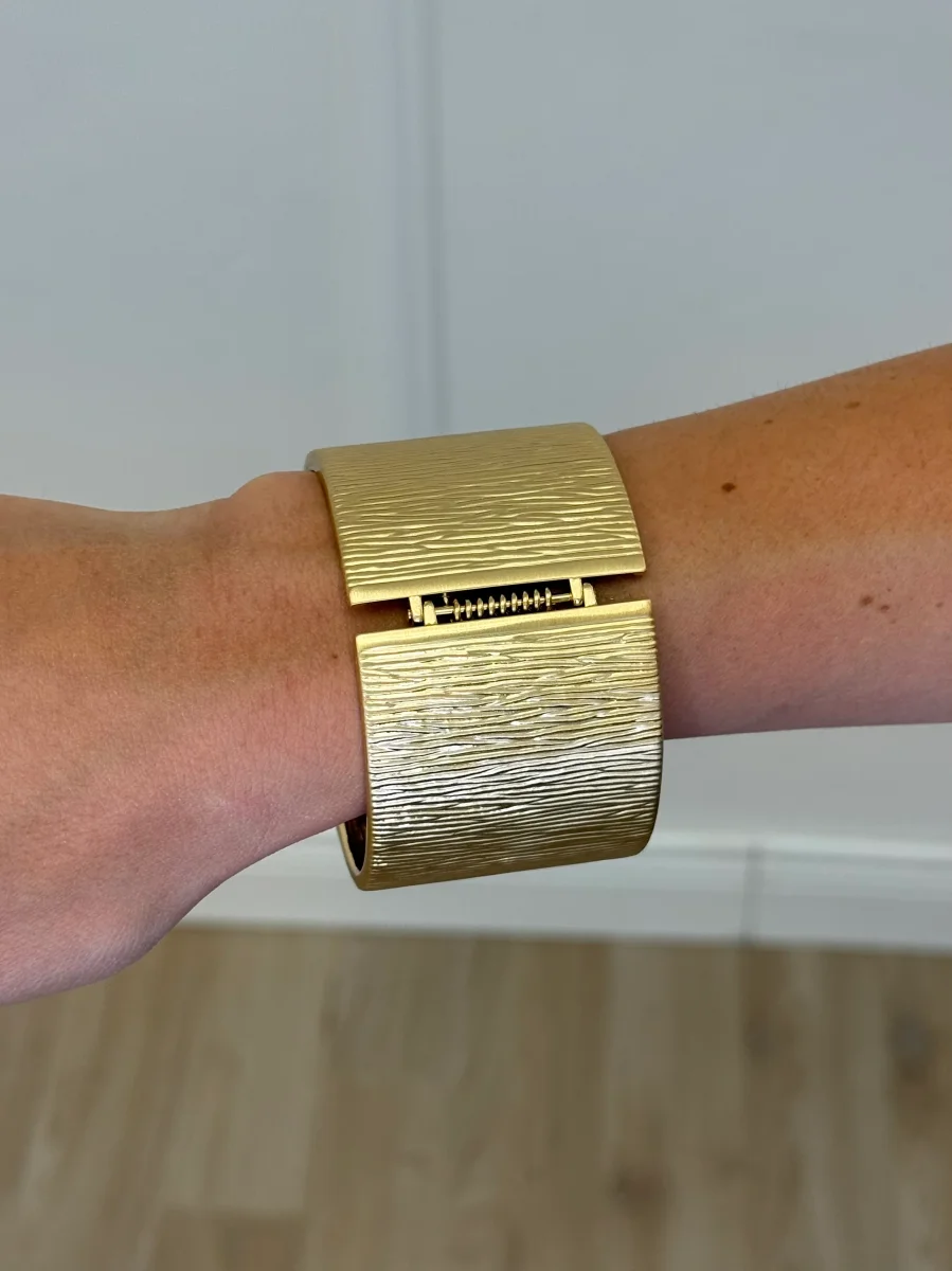Bracciale rigido a fascia con apertura a molla e finitura all over.