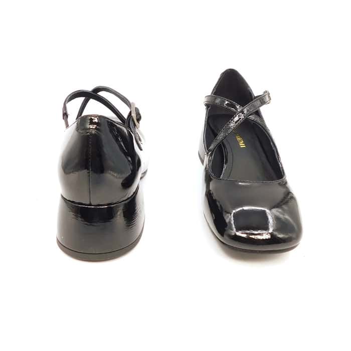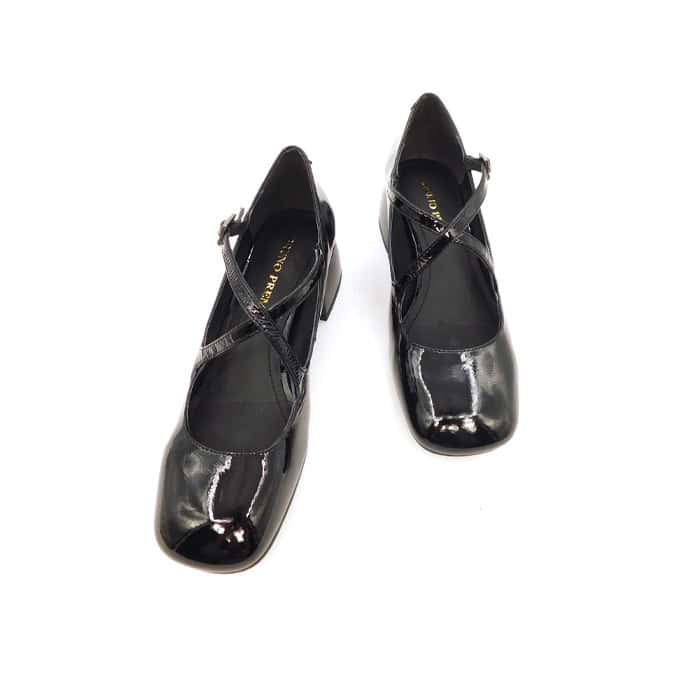 Mary-Jane in pelle finish lucida nera. Cinturino incrociato. Interno in pelle. Tacco 4 cm.
