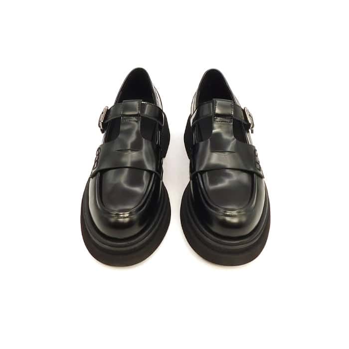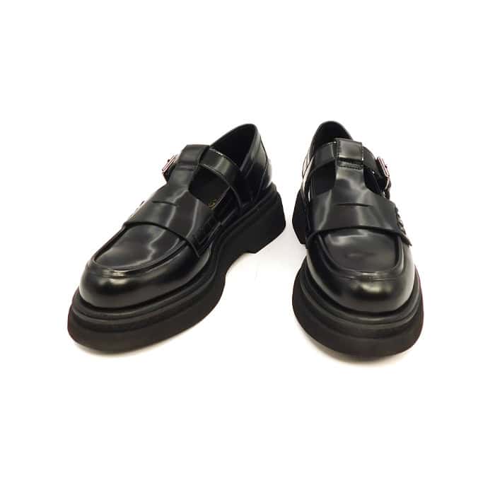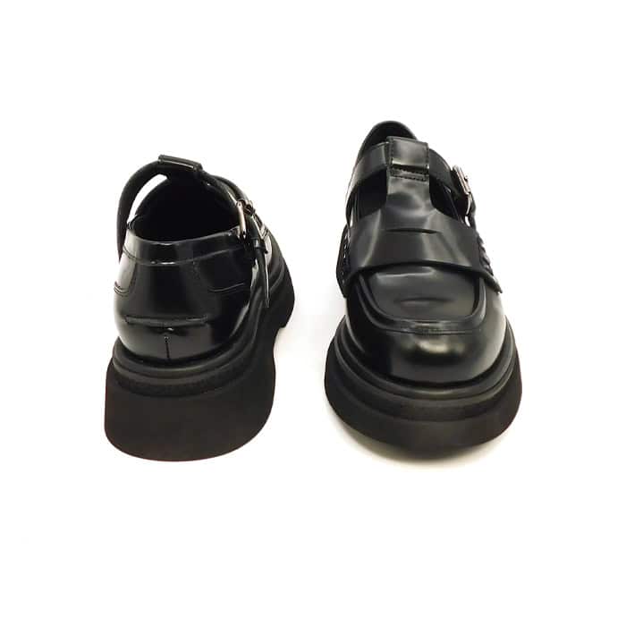 Scarpa in tomaia abrasivato nero con cinturino laterale. Fondo in gomma 2cm. Interno in pelle.