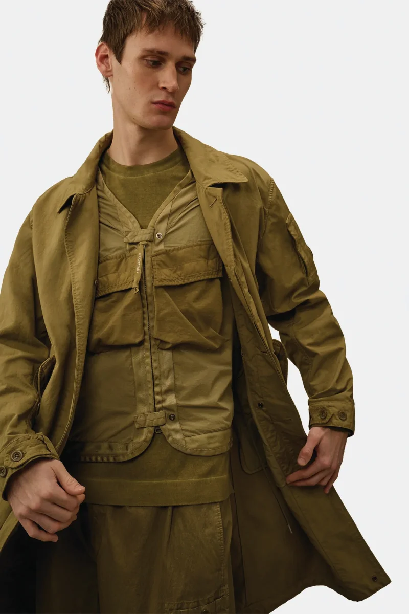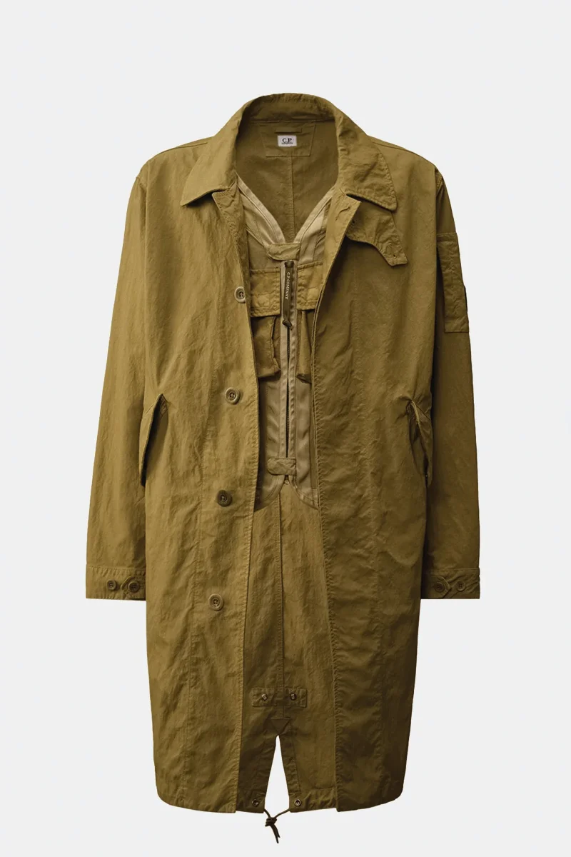 Car coat fishtail con gilet integrato realizzato in Twill, ottenuto dallโintreccio di due filati nylon taslan. Il cappotto presenta un colletto classico con linguetta e bottone, chiusura con bottoni nascosti e bottoni automatici, tasche laterali applicate con patta e bottoni automatici e un taschino con lโiconica Lente di C.P. Company sulla manica. La vita regolabile con coulisse, i polsini con patta e bottoni e lโorlo posteriore a coda di pesce assicurano una vestibilitร funzionale. Il gilet interno รจ dotato di chiusura full zip a doppio cursore con linguette e bottoni automatici, e di tasche sul petto con patta e bottoni automatici. La giacca รจ tinta in capo per ottenere intensitร cromatiche uniche che si esaltano con il tempo e lโutilizzo. Regular fit.