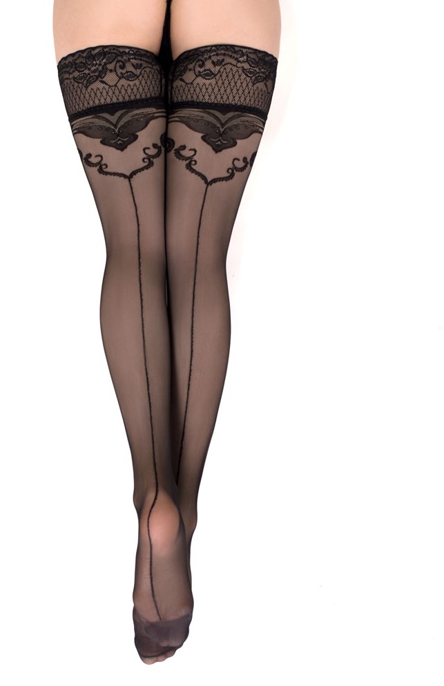 Seducenti calze autoreggenti velate colore nero in Lycra con balza lavorata siliconata ed eleganti ramage neri dietro con riga centrale. Filo setificato da 20 denari , perfette da abbinare ai completini con reggicalze, o guepiere o corsetti, ma anche con i body senza reggicalze.