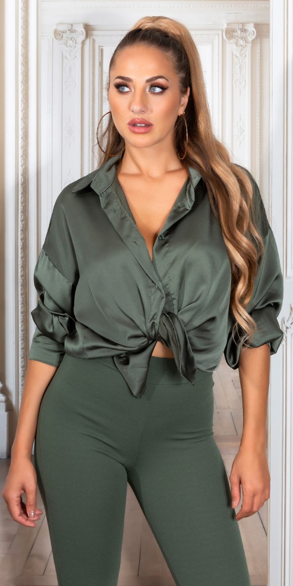 Camicetta elegante e sexy oversize in tessuto effetto raso. Da annodare in vita per un look sofisticato e femminile.