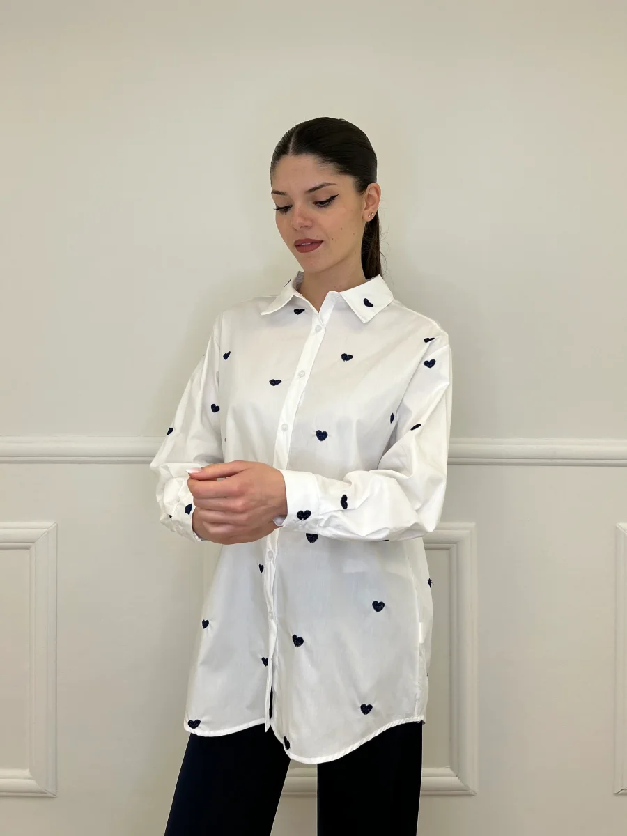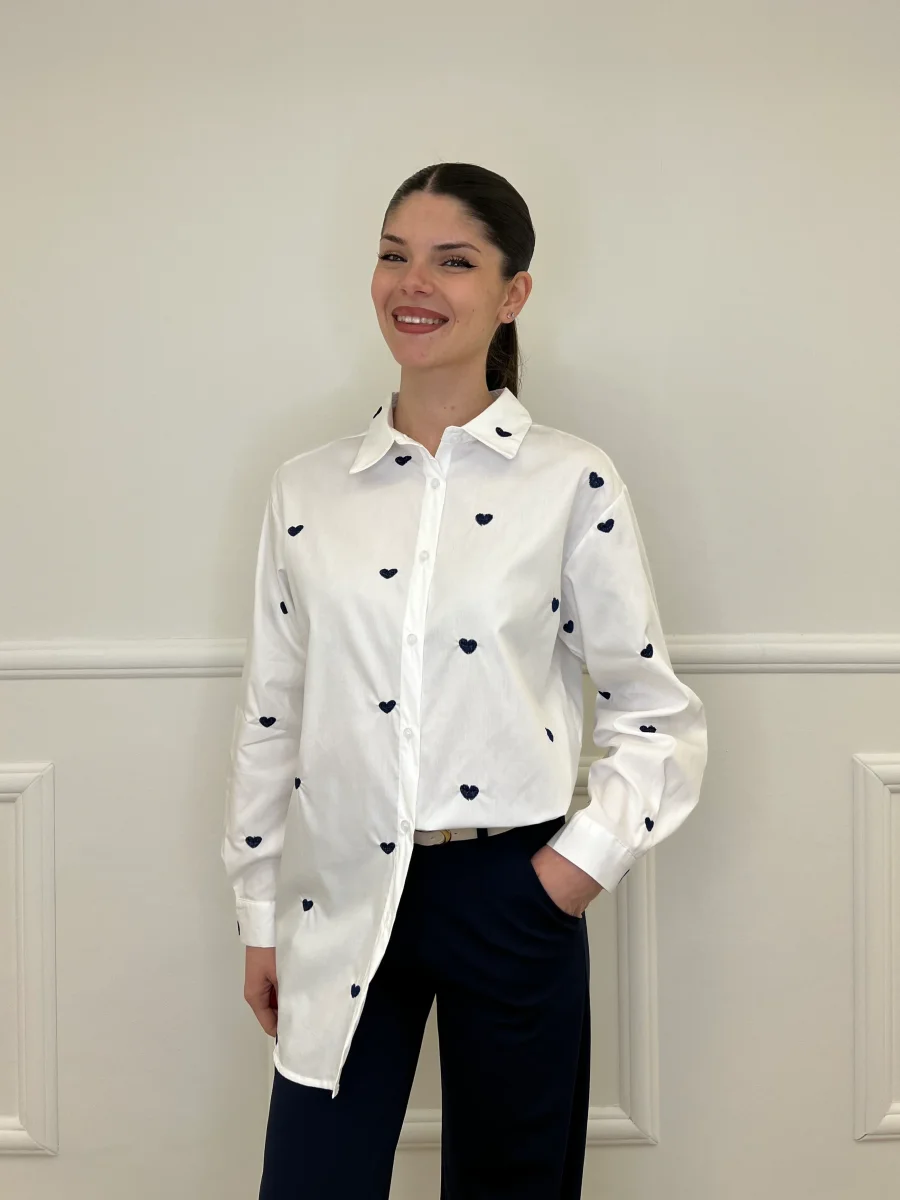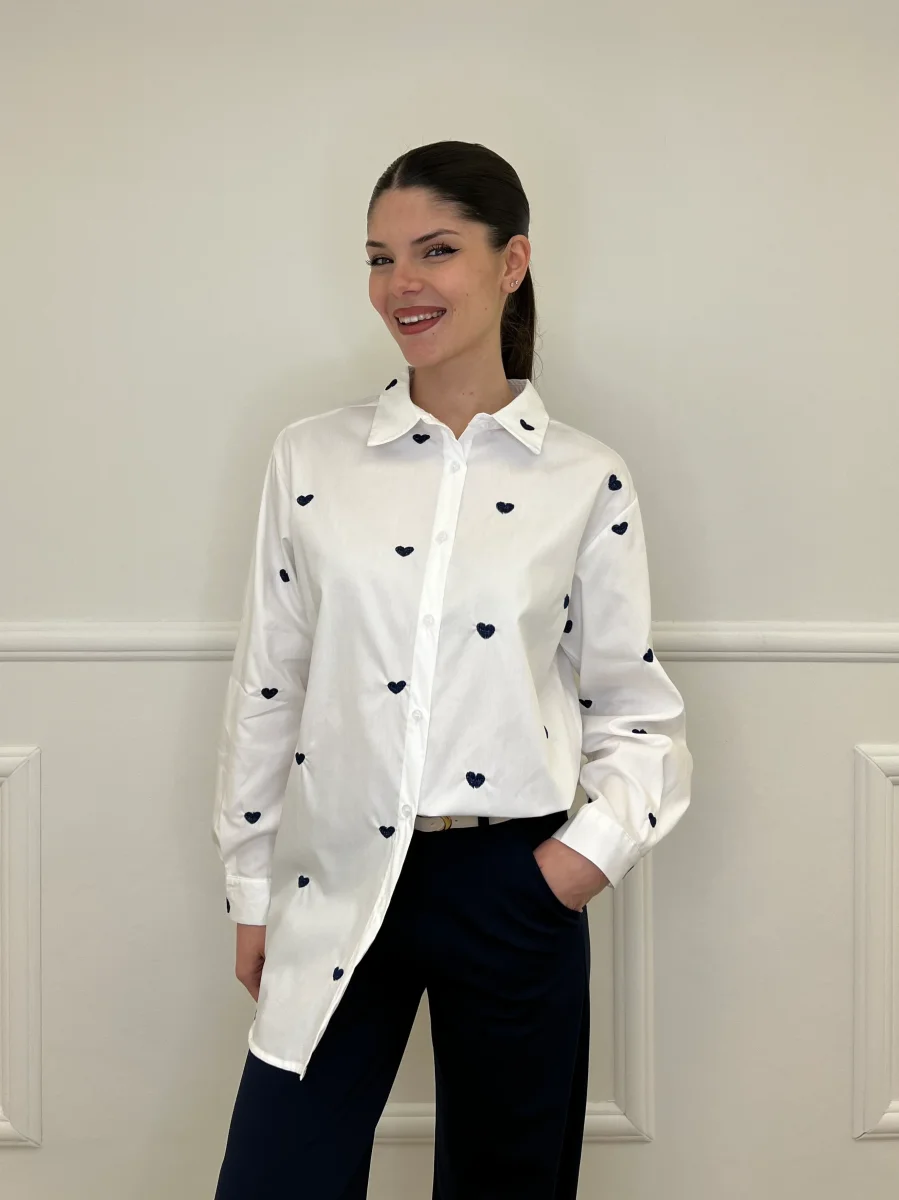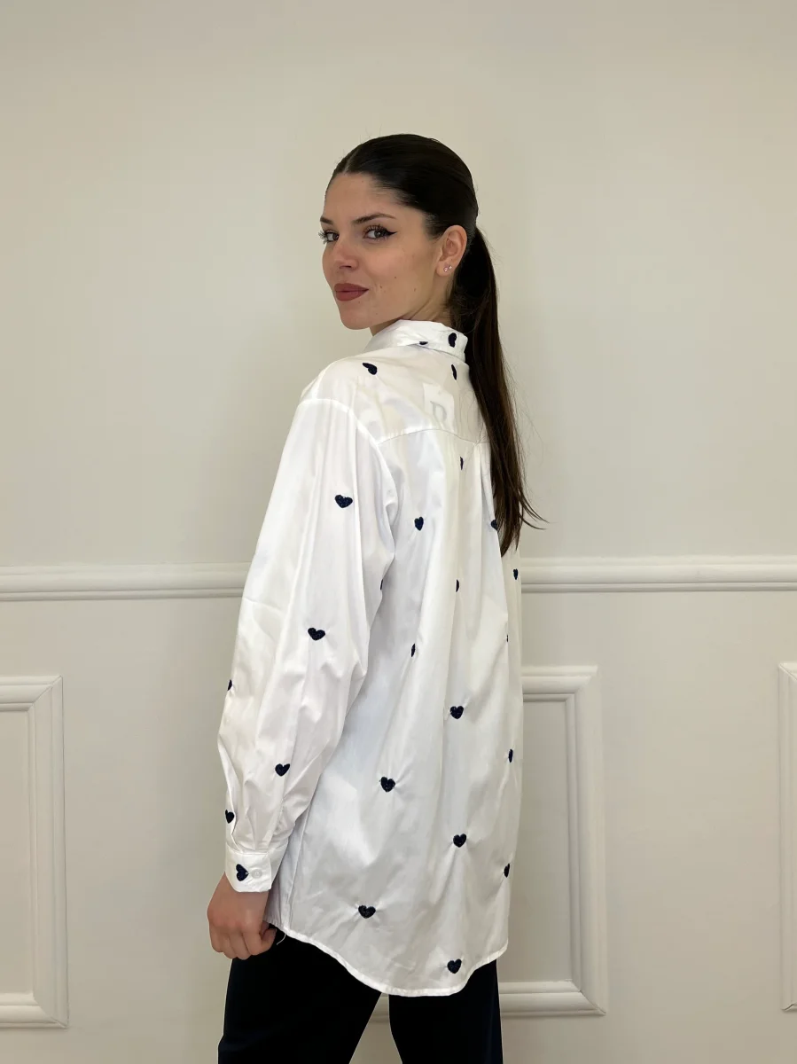 Camicia oversize in puro cotone con cuori ricamati a contrasto “all over”.
