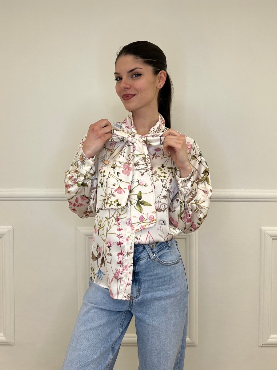 Camicia in satin in fantasia floreale, taglio dritto, con maniche raglan a palloncino e collo alla coreana regolabile con fiocco.